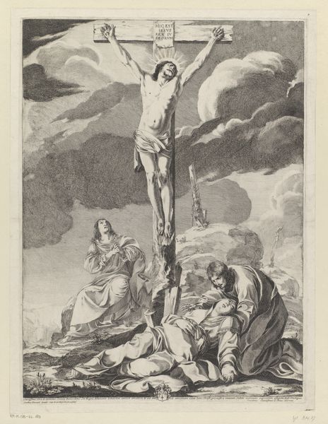Editor: So here we have "Kruisafname: tweede plaat" or "Descent from the Cross: second plate", an etching and engraving by Rembrandt van Rijn, dating probably from 1633. It’s overwhelmingly…dark. Claustrophobic even. What do you see when you look at this work? Curator: Dark indeed. But also powerfully lit, wouldn't you agree? Think of light not just as illumination, but as emotional revelation. See how the figures lowering Christ from the cross are bathed in it? They’re active, alive, wrestling with a terrible task. Yet at the base, others huddle in shadow, consumed by grief, lost in their private hell. Editor: Yes, that contrast is striking. The light feels almost…theatrical. Was Rembrandt consciously staging this? Curator: Staging... now that’s an interesting way to look at it! Remember, Rembrandt was a master storyteller. He uses light and shadow—chiaroscuro—to focus our attention. And not just on the *what*, but on the *how*…how does faith look in the face of immense sorrow? It’s not a clean, easy answer. Editor: I suppose I had imagined it to be…grander? It feels so intimate, like a secret glimpse into suffering. Curator: Exactly! Etching allows for that intimacy. Unlike grand historical paintings, prints were for smaller, private devotion. Rembrandt offers not a glorious spectacle but a human tragedy, made all the more visceral by the darkness pressing in. Almost feels as though he is dragging the viewers right in with the mourners below... wouldn't you say? Editor: I think you are right! Seeing the raw emotion captured like that is amazing, particularly the grieving faces in shadow - much to mull over. Curator: Well, it certainly gives new weight to the concept of 'divine darkness,' doesn't it?