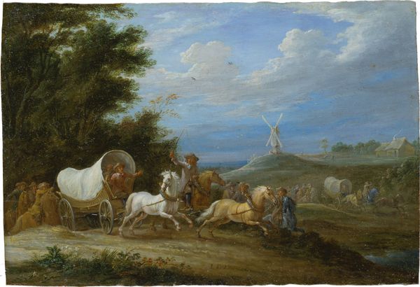 Editor: Here we have Adam van der Meulen’s "Halte De Cavaliers" from 1660, painted in oil. I'm immediately drawn to how it depicts both a scene of leisure and what feels like preparation for something. It's a rather busy composition. What strikes you when you look at this piece? Curator: It's important to consider the conditions of its making. Van der Meulen was often commissioned to create propagandistic depictions of Louis XIV's military campaigns. While this genre scene appears less overtly political, the quality of the materials – the costly oil paints, the fine linen canvas – speak to the patronage system and the artist's role within a specific economic and social structure. Editor: So, even without explicitly depicting Louis XIV, the artwork still reflects the power structures of the time? Curator: Precisely. The landscape itself, and how it is portrayed, can be understood as a resource – land controlled, traveled through, potentially conquered. Think about the materiality of landscape painting itself: pigments derived from the earth used to represent…the earth. Editor: That's a fascinating point. The creation of the painting, the pigment and canvas production, reflect a type of economic landscape. Does that change the way we view the narrative aspects, like the riders? Curator: I think it forces us to recognize that these seemingly 'natural' or leisurely scenes are still products of a specific social order, facilitated by networks of labor, trade and power. The artist's hand is also a labor here. This wasn't just some aesthetic experience; it was a crafted object reflecting a structured exchange. Editor: I hadn't considered that perspective before. Seeing it as a document of labor and material relationships gives it a whole new layer of meaning. Curator: Exactly, by looking closely at how things are made, who makes them, and what purpose they ultimately serve, we gain a more complete picture of not just the art, but the era itself.