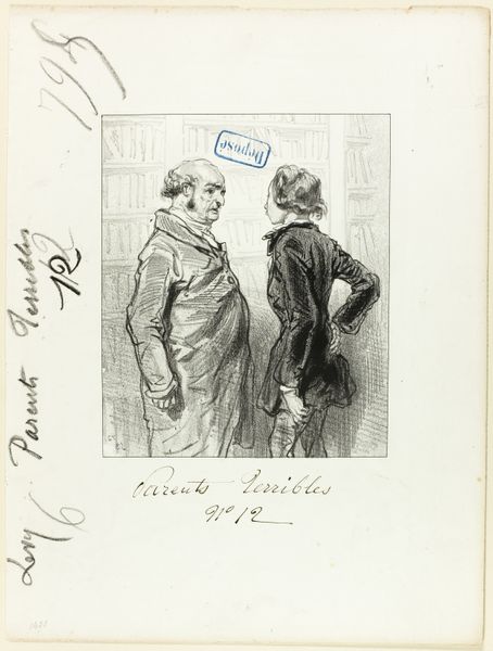 This lithograph, part of Paul Gavarni's "Les-Parents-Terribles" series, captures a moment of familial tension with stark lines and contrasting textures. The scene is dominated by two figures, a son and his father, rendered in Gavarni's signature style of detailed, expressive draftsmanship. The father's raised gaze, and the son's gesture towards him, creates a visual dialogue charged with unspoken conflict. Gavarni masterfully uses line to convey emotion; the father's rigid posture, created with tight hatching, contrasts sharply with the looser lines defining the son's pleading expression. The composition, spare yet deliberate, places these figures in a shallow space, emphasizing their psychological proximity and the palpable tension between them. The lithographic medium, with its capacity for subtle gradations of tone, enhances the overall effect, lending a nuanced depth to the narrative. Gavarni's decision to leave the background minimal further directs our attention to the characters and their fraught interaction, highlighting the artist's commentary on the domestic dramas of his time.