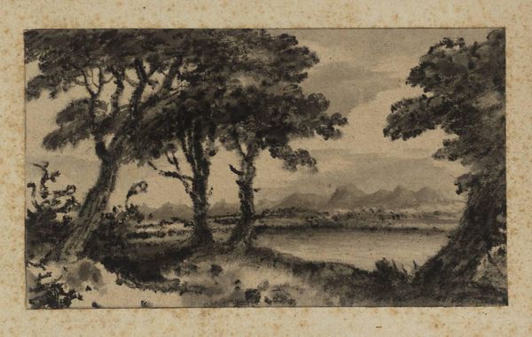 Editor: So, this is André-Marie-Paul Borel's "View of a Shore," created around 1881. It's an etching, giving it this really intricate, almost shadowy feel. I find it quite somber, actually. What do you see in this piece, especially considering its visual language? Curator: The landscape, the shore… it all feels imbued with a sense of transition, doesn’t it? Look at the single sailboat; a traditional symbol for a soul’s journey, its mast reaching to the heavens. The lone tree seems to echo that reaching, as though tethered, an earthly monument bridging water and sky. Notice how the darker foreground, almost oppressive, throws into sharper relief the hazy distance. Does it stir within you a yearning? Editor: Yes, a longing almost. The darker foreground is definitely weighing on me, so the faint light reflecting off the water is appealing, hopeful. The tree, though…it feels sturdy but isolated. What do you make of that isolation? Curator: The isolated tree stands for resilience, wouldn’t you say? Even in monochrome, the textures practically vibrate, etching the permanence of memory itself. The landscape is no longer simply a place, it has become a stage for contemplating what it means to endure, persist, even to simply "be" when time carries all things forward and away. The tree’s loneliness embodies this, in my mind. What aspects are most memorable for you? Editor: It’s the layers, definitely – the darkness yielding to light, the solid shore facing the endless water… it feels like a visual poem. Curator: A perfect summation. It is by looking closely into a still moment, and through shared symbolism that we discover deeper significance.