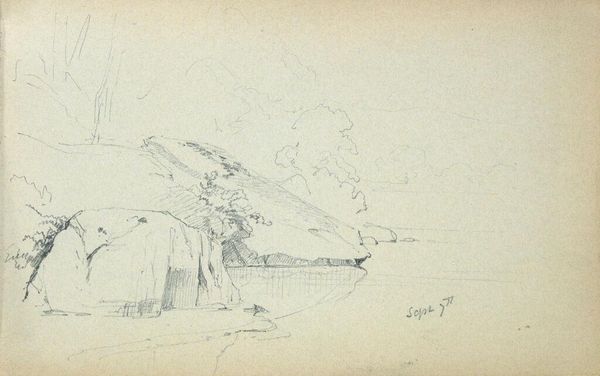 Curator: This small sketch, "Rocky Outcropping" by Benjamin Champney, feels so immediate, doesn't it? Like a fleeting impression captured on paper. Editor: It’s spare, almost diagrammatic. I'm curious about the paper itself—the tooth of it, and what kind of pencil he used. Was this stock readily available? Curator: I imagine Champney was more focused on the light hitting the rocks, the way the landscape unfolds. It feels like a memory of a place, rather than a precise rendering. Editor: Perhaps. But the labor of the hand, the repetitive strokes giving form to the rock, that’s something too. The economy of line speaks volumes about the economics of artmaking at the time. Curator: It's interesting how you bring materiality into it. I find myself drawn to the way the artist simplifies nature, almost distilling it to its essence. Editor: And yet, the means dictated the art. A larger sheet, a different tool, and we might have a very different essence, wouldn't we? Curator: Maybe you're right. This little sketch prompts a lot to think about! Editor: Indeed. From geology to artistry, it's all there in the graphite and paper.