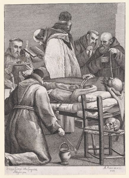 Cornelis Hellemans made this print, "Figureren met luizenkam", using etching. Images of peasants removing lice from each other’s hair were very common in the Netherlands and other parts of Europe from the sixteenth through the nineteenth centuries. These scenes spoke to contemporary issues such as hygiene, social class, and the perception of rural life. This etching uses recognizable visual codes to represent the people as belonging to a lower class of society, such as plain clothing, simple interiors and evidence of manual labor. The meaning of this image can be interpreted through the social structures of the time, particularly the divide between urban and rural populations. To understand this artwork better, we can research Dutch social history, the representation of peasants in art, and the cultural significance of hygiene in different periods. The meaning of art is always contingent on its social and institutional context.