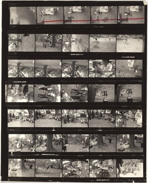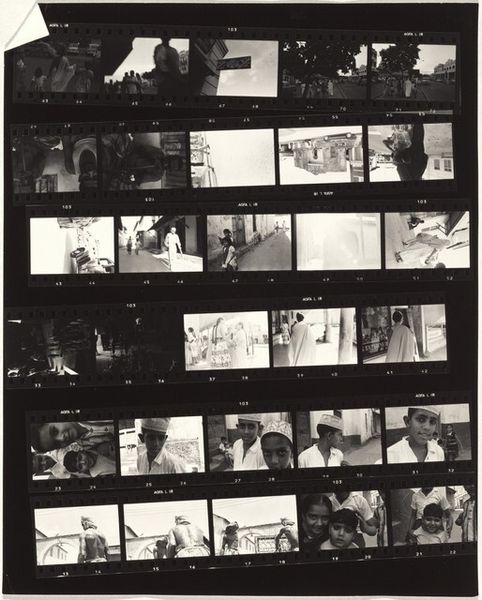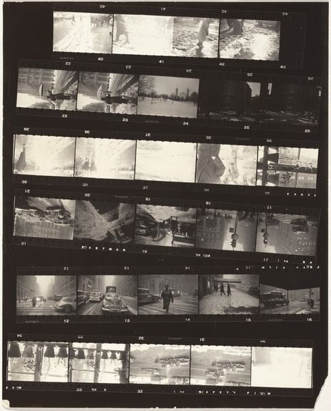 This is Robert Frank's contact sheet, "Guggenheim 708--Casper, Wyoming." It's a fascinating object, made using photographic film and darkroom processes. Contact sheets like this are the direct result of the photographer's labor, a record of their choices in the field. The very nature of film—the way it captures light and shadow—imparts a gritty realism to Frank’s images. Each frame on this sheet is a moment captured, a decision made about composition and subject. Look closely, and you can see the physical process: the sprocket holes along the edges, the frame numbers. This wasn’t about precious materials or refined techniques; it was about getting out there, observing, and documenting. Frank engaged with the social landscape directly. The contact sheet offers a glimpse into his working method. It reminds us that art isn't just about the final, polished product, it's about the whole process: the labor, the decisions, and the engagement with the world. It blurs the line between documentary, craft, and fine art.