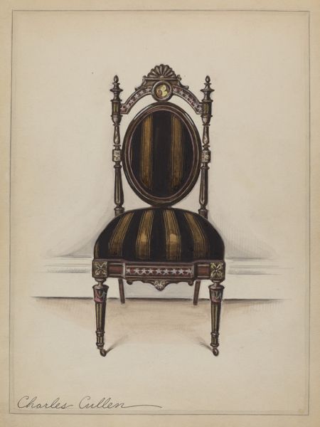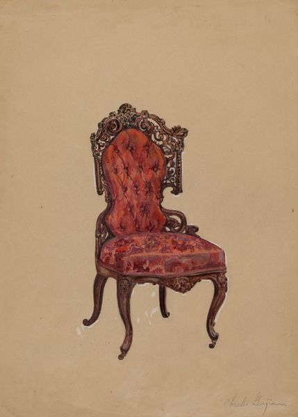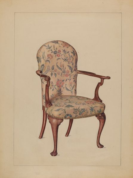 Florence Truelson made this drawing of a Queen Anne Chair, likely around the 1930s, using graphite and colored pencil. The velvety texture of the upholstered seat and back is beautifully rendered, yet the lines of the drawing remain crisp and technical. Truelson has highlighted the chair’s carved wooden elements. Notice the cabriole legs, ending in pad feet. These kinds of details evoke a sense of luxury and refinement. But the drawing also shows the chair's construction, the way the frame supports the plush surfaces. It's clear that skilled labor went into both the making of the chair itself, and into Truelson's record of it. We can see how a piece of furniture, so often considered either a purely functional object or a symbol of status, can also be understood as a product of design, and the skilled trades that make design possible. Truelson's drawing makes us think about the relationship between art, craft, and industry.