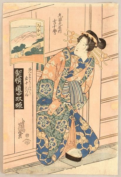 Utagawa Kunisada crafted this woodblock print, "Young Woman on a Veranda," capturing a moment of serene beauty. The woman's elegant kimono, patterned with stylized floral motifs, speaks volumes about her status and refined taste. The image resonates with archetypal gestures found across cultures. Her outstretched hand, lightly touching the window frame, echoes similar motifs of connection and reach seen in Renaissance art, evoking a sense of longing and interaction with the world beyond. Water flows in the background, an indication of constant and never ending change, as the woman remains unchanged within the confines of her domesticity. These symbols are not static; they transform, carrying the weight of history and cultural memory. This print isn't merely a depiction; it’s a node in a vast, interconnected web of human expression, engaging our subconscious and stirring echoes of shared experiences.
