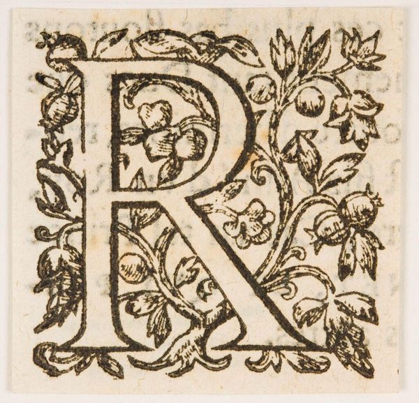 Editor: This is "Letter R," an anonymous print. It's quite small and simple, but the botanical motifs filling the space around the letter are captivating. What is your interpretation of this piece? Curator: The image presents a dichotomy between the rigidity of the letterform and the organic shapes of the floral elements. The interplay between line quality and the textural properties of the printmaking process are also notable. Editor: I hadn't thought about the contrast between the letter and the floral designs. Curator: Note how the "R" asserts itself through its geometry, yet is softened and integrated by the surrounding flourishes. Editor: I see it now! Thank you for pointing that out. Curator: Of course. The formal elements create a visual and conceptual tension, ultimately harmonizing. Editor: That gives me a new appreciation for such a small work.
