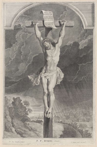 Editor: This drawing, a reproduction after Anthony van Dyck's 'Saint Francis at the Foot of the Cross,' rendered in pencil and charcoal sometime between 1893 and 1912… it's incredibly somber. The muted tones and the stark contrast between the figures… what do you see when you look at it? Curator: I see an incredibly potent image, charged with layers of meaning. The figure of Saint Francis, gazing upward, clinging to the base of the cross – it speaks volumes about faith, suffering, and the empathetic human connection with divinity. Van Dyck masterfully uses the cross not just as an instrument of death but as a visual conduit, an axis mundi, between earthly pain and the promise of transcendence. Editor: Axis mundi? Curator: Yes, the world’s axis. In many cultures, key symbols function as a point of connection between the earth and the heavens, reminding us that sacred places enable spiritual transformation. Notice how the artist positions Saint Francis – he embodies humility and devotion, doesn't he? Consider, also, the historical context of baroque art – the theatricality, the emotional intensity. How does this drawing amplify or diminish those baroque sensibilities for you? Editor: I guess it's there in Saint Francis's reaching out. So much emotion there, and such a specific cultural story being retold through these images, even in reproduction. It's incredible how symbols persist and continue to resonate across time. I hadn’t thought of it as an axis between worlds before. Curator: Exactly! Each line, each shadow, echoes centuries of art and belief. Seeing it reproduced invites another layer of appreciation: for its lasting power. Editor: I’ll definitely be looking at religious art differently from now on. Thank you!