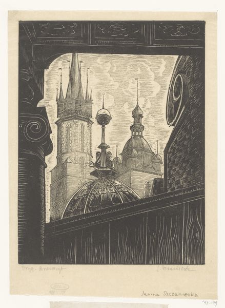 Curator: This striking image is Stefan Swostowiez's "View of the Wawel Cathedral in Krakow" from 1941, a woodcut print. I find its stark black and white contrast quite compelling. What are your first impressions? Editor: It feels heavy, almost oppressive, perhaps because of the limited color palette. The cityscape, although beautiful, feels caged, like it's being viewed from a confined space. What do you make of this sense of enclosure? Curator: That feeling of being "hemmed in" is so potent, isn't it? I think the artist is deliberately using that perspective, that tight framing, to evoke a specific emotion. It’s as if the cathedral, usually a symbol of hope and transcendence, is burdened, suffocated almost. Consider the context: 1941, Krakow under Nazi occupation. Perhaps that oppressive feeling is not just aesthetic but deeply rooted in the socio-political climate. What visual clues confirm this? Editor: The heavy use of black ink…almost blotting out detail and nuance…the claustrophobic framing that you mentioned. But what about the choice of the Wawel Cathedral itself? What might that signify? Curator: Precisely. The Wawel Cathedral wasn’t just a church; it was a symbol of Polish national identity, its history and resistance. Presenting it this way, distorted and seemingly trapped, amplifies the sense of loss and restriction imposed by the occupation. Think about what the artist might have felt creating this. Does this shift your interpretation? Editor: Absolutely. It goes from being a striking, though somber, landscape to a powerful statement about resilience amidst oppression. Thanks. I would never have got that from just a glance. Curator: And I probably wouldn't have looked so hard without your observations, to begin with. Art is always better when discussed.