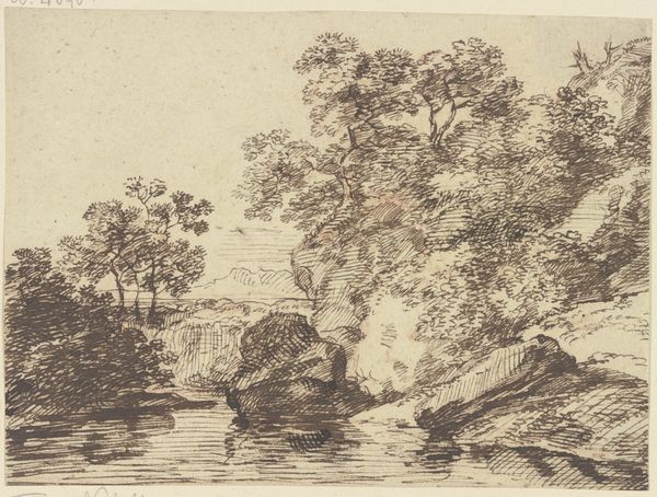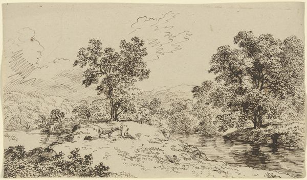 Curator: Looking at this detailed landscape, made with ink on paper, one almost feels transported to a serene lakeside. Editor: It certainly evokes a sense of calm. The composition is dominated by the meticulously rendered trees and reflections on the water’s surface, creating a pleasing horizontal balance. Is it by any chance an etching or engraving? The detail is astonishing. Curator: Good eye. It’s "Bäume und Staffage an einem Gewässer" – that’s "Trees and Figures by a Body of Water" – rendered in ink and engraving. While undated, it’s attributed to Franz Kobell and resides here at the Städel Museum. I’m struck by his skilled handling of the etching technique to create such delicate variations in tone. Editor: I agree; it makes you wonder about Kobell's own relationship with the landscape. Etchings at the time served various functions, from preparatory sketches for larger works to standalone artworks for print. How accessible were these images, do you know? Curator: Landscapes such as these, rendered in a more accessible medium, played a significant role in shaping perceptions of the countryside. Think about it; they were disseminated to wider audiences beyond the elite, influencing social ideals related to nature and leisure. The way trees are so deliberately placed— almost like stage props — speaks to that performative aspect of landscape consumption. Editor: Absolutely. One can imagine how an etching such as this could circulate, not just as a study, but contributing to larger conversations surrounding land use, ownership and the very idea of the pastoral. It suggests a constructed ideal rather than a purely objective view of nature. Curator: Exactly. By analyzing these prints, we see the commodification of an artistic experience of the pastoral lifestyle. How different that lifestyle probably was to reality. It is like a purchased experience. Editor: The careful composition and material choices speak volumes about how landscapes, and indeed 'nature' itself, become culturally loaded objects. It’s been interesting thinking through these issues, material choices, techniques and cultural impact all together. Curator: Agreed, seeing through that lens of production gives me renewed appreciation for Kobell's delicate, thoughtful, yet purposeful execution.