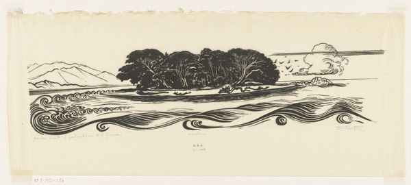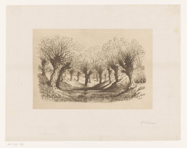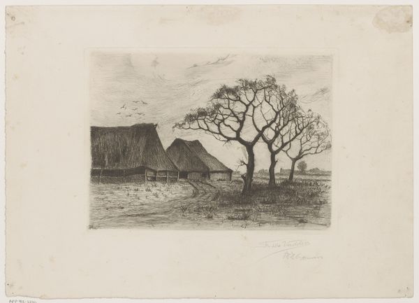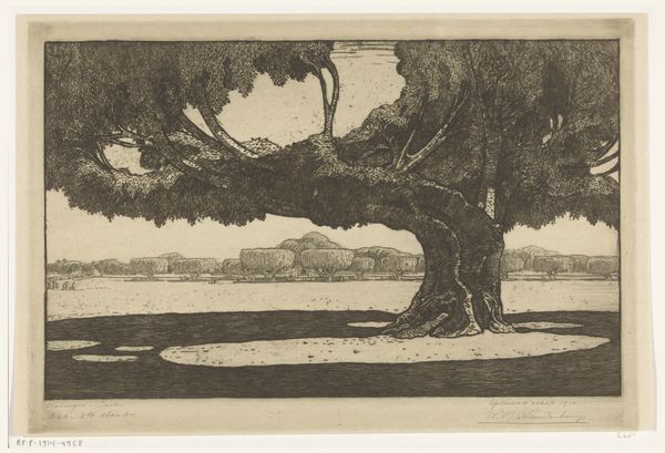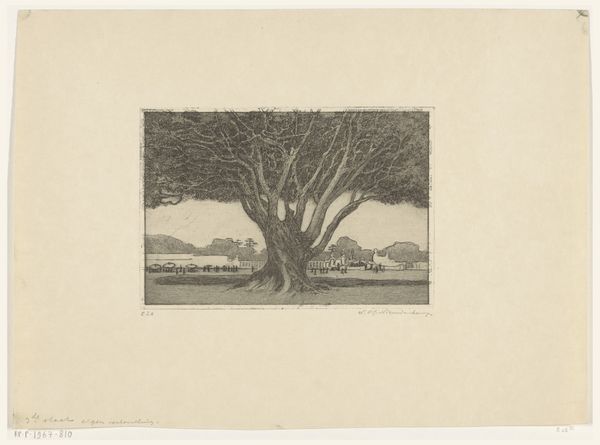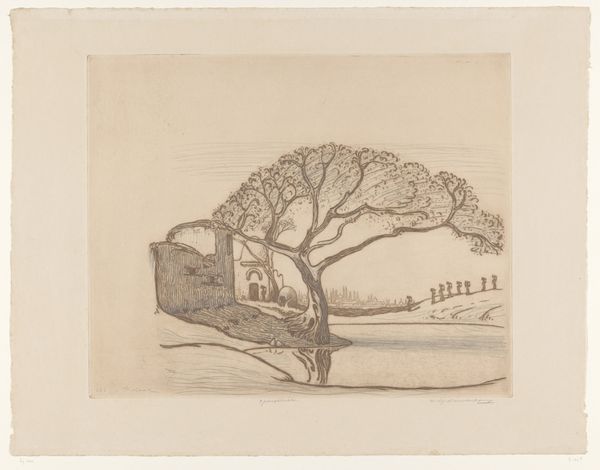 Curator: Right, let's dive into this evocative scene. We are looking at Wijnand Otto Jan Nieuwenkamp's "Boom aan een vijver bij Caïro", or "Tree by a pond near Cairo," possibly from 1911. Editor: Hmm, a preliminary sketch then? It feels so serene, a quiet moment captured with delicate precision. The monochromatic sepia washes a consistent palette over everything and produces a contemplative mood for me. Curator: Indeed. Note the economy of line, especially in the reflections in the pond. Nieuwenkamp masterfully uses suggestion rather than detailed depiction. The structural solidity of the tree, contrasted against the fainter lines of figures in the landscape creates depth using these semiotic signs. Editor: Yes, and I’m really drawn to the composition—how the gnarled branches of the tree reach across almost the entire scene, as though encompassing everything in their embrace. I feel it as though the pond and building, with the diminutive people on the distant hilltop, are just incidents on the larger surface of its spread. Like an experience of rootedness and expansive belonging at the same time. Curator: That’s a perceptive observation. He clearly delights in the textural qualities achievable through etching and drypoint. The building and the lines of figures gain an antique status and effect because of it. Look at the shadows on the building that frame the edges and bottom of the composition, and the contrast and implied depth which that creates in tension with the flattened sky and reflections. Editor: I wonder, does the location, Cairo, have resonance? The art-historical, romantic Cairo of popular imagination that Nieuwenkamp appears to take interest in through his old engraving style of making this sketch. Curator: Most likely. While seemingly simple, it’s a rather sophisticated play of positive and negative space, drawing the eye deeper into the landscape but withholding detailed resolution. The antique method of creation is what seems to allow this resonance, not merely his choice of subject or location to begin with. Editor: There's a beauty here, a poignant simplicity... a quiet nod to the enduring quality of landscape in times and places which feel quite distant to the everyday life of the contemporary West.