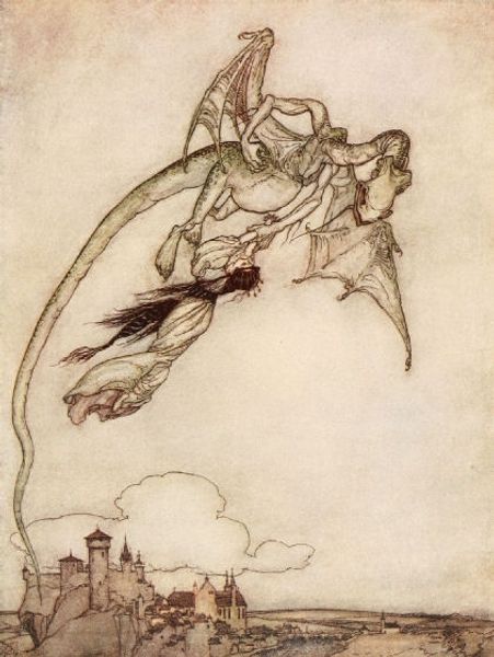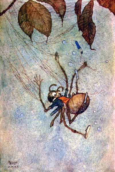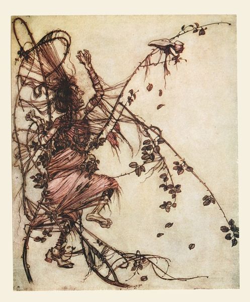Arthur Rackham made this illustration, "The Gnat and the Lion," with ink and watercolor, a medium that allows for both precision and ethereal washes. The careful lines of the web and the creatures’ spindly limbs show us a world made from fragile materials. Look how Rackham uses transparent layers to create a misty, dreamlike setting! The colors are muted, almost melancholic, with grays and browns dominating. It’s the kind of palette that lets the imagination wander into darker corners. See how the artist renders the spider and the gnat with almost human expressions? The artist animates the natural world, drawing us into their tense encounter. Rackham's work reminds me of other illustrators like Edmund Dulac, who also found beauty in the fantastic and grotesque. Ultimately, this piece invites us to consider the balance of power and the unexpected dramas playing out in the smallest corners of our world.