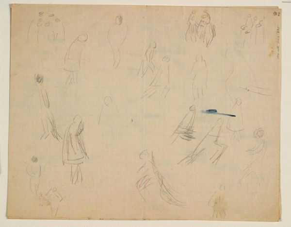 This drawing, made by Niels Larsen Stevns, explores figures in motion using graphite on paper. The lightness of the graphite allows for quick, almost ephemeral marks, capturing fleeting gestures and poses. The choice of material is crucial here; graphite, easily erasable, suggests a process of trial and error, of capturing movement as it unfolds rather than freezing it in a static form. The texture of the paper, though subtle, also plays a role, offering a slight resistance to the graphite, influencing the quality of the lines. You can see a multitude of figures that almost give the impression of sequential movement, like that of early motion picture experiments. It reflects a focus on process and experimentation over the final, polished product. By valuing these 'working drawings' as artworks in their own right, we challenge traditional hierarchies between sketch and finished piece, highlighting the value of process, and the labor of artistic exploration.