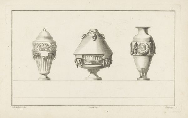 Editor: Here we have "Three Vases," an engraving made in 1771 by Augustin Foin. They seem very neoclassical in style; the lines are crisp and the shapes are deliberately classical. What can you tell me about this print? Curator: Note how Foin meticulously renders these objects not as singular, unique creations, but as replicable models. The engraving medium itself underscores this, cheapening art objects that otherwise belonged to the sphere of luxury and ennoblement. Think about how prints, during this era, functioned as tools for disseminating taste and style, impacting the production and consumption of decorative arts. What are the socio-economic implications here? Editor: It makes me think about mass production even back then, and how even something supposedly high art could become almost a commodity. I guess it’s interesting how the medium democratizes the art, but almost strips the meaning too. Curator: Precisely. Consider the material properties. It’s paper, ink – commonplace materials used to represent potential objects of great value, intended for entirely different environments. What kind of power dynamic is at play when accessible media like engravings help disseminate idealized versions of ‘high’ art to a potentially broader consumer base? It raises questions about labor, class, and access. Editor: So the value is less in the image itself and more about what it represents and its relationship to production. Thank you; I see it now from a completely different perspective! Curator: Indeed. Reflect on how seemingly straightforward images such as this can reveal underlying structures of artistic creation, economic forces, and class aspirations.