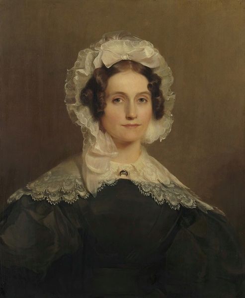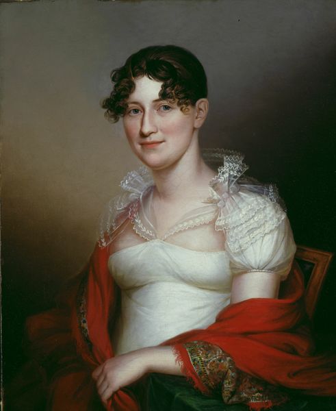 Curator: We're now looking at John Vanderlyn’s oil painting, "Mary Ellis Bell (Mrs. Isaac Bell)", created around 1827. Editor: It’s remarkable how Vanderlyn captured a sense of reserved elegance. The creamy hues and smooth brushstrokes create such a placid atmosphere. Curator: Vanderlyn was quite established at this point. Commissioned portraits were bread and butter for artists, providing financial stability, especially within burgeoning mercantile elites such as the Bells. This portrait signifies Mrs. Bell’s position in society. Editor: Note the reflected profile—an ingenious doubling. What do you make of the classical setting for a woman of the American South? Curator: The Neoclassical style was incredibly fashionable and useful in framing elites; a way to link themselves with the virtues of the ancient Republic. Her almost Grecian gown, high-waisted, adds to the timelessness Vanderlyn wanted to achieve. We mustn't forget, too, the complex social dynamics at play: Isaac Bell, her husband, profited as a cotton broker, indirectly off the slavery system. These beautiful artworks often veil unsettling realities. Editor: Indeed. Looking closer at the surface, the gentle modulation of light across her face and the folds of the dress demonstrate great technical skill, regardless of its societal function. See how the flower at her waist draws the eye. Curator: These are powerful statements made by this artwork of Vanderlyn at the time. How did patronage reinforce hierarchies? These portraits memorialize particular individuals within a system of social inequality. Editor: It’s easy to become lost in the elegance and forget these complexities. But returning to the formal qualities I am left with an admiration for Vanderlyn's artistic skills Curator: And I will carry with me a more complex and contextualized understanding.
