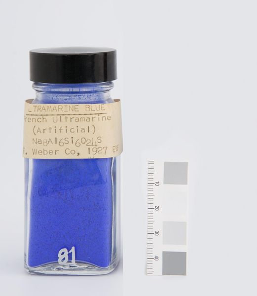 Curator: Here we see Manganese Blue, produced by Stanley Doggett. It presents a striking blue pigment in both its raw powder form and as a painted swatch. It's captivating, isn't it? Editor: It's incredibly evocative. The pure pigment housed in glass beside its application makes me think about the means of production and the labour involved in creating just this one vibrant shade. Curator: Absolutely. And consider the cultural implications, the historical moment when this synthetic colour emerged, impacting artists' palettes and visual culture. Editor: And how different artists' access to the colour altered the landscape of art production. It really prompts one to consider the materiality and the social impact of this colour. Curator: I agree, seeing pigment in its pure form really opens up a critical dialogue about art-making. Editor: Indeed. It all comes down to the means by which art is produced, and the consequences thereof.