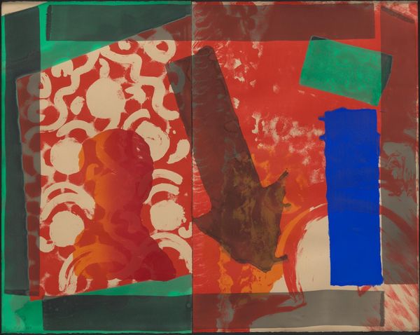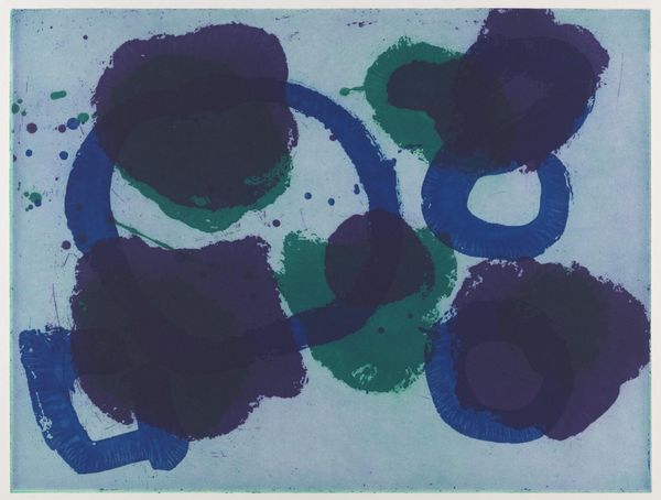 Editor: Here we have an untitled print by Patrick Heron from the Tate Collection. It's a riot of colour – mainly blues, greens and a sort of rusty red. It feels like a glimpse of a garden through a rain-streaked window. What do you make of it? Curator: Rain-streaked, yes! For me it feels like a memory of a garden, filtered through emotion. Look at the way those colours bleed into each other, not quite contained, like feelings overflowing. Do you get a sense of joy from the composition? Editor: Definitely! The colours are so playful. It makes me want to grab some paints myself. Thanks for your insight. Curator: My pleasure! It’s a print that makes you feel rather than think, and that's quite wonderful, isn’t it?