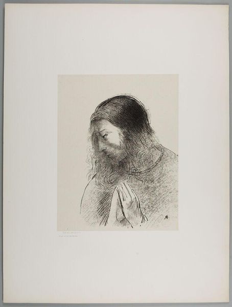 Editor: Here we have Odilon Redon’s lithograph from 1899, “C’est moi, Jean, qui ai vu et qui ai ouï ces choses”—or "It is I, John, who saw and heard these things." The somber tonality and introspective pose create a feeling of intense contemplation. What strikes you about the composition of this print? Curator: Formally, the success of this lithograph resides in Redon’s strategic deployment of chiaroscuro, wouldn’t you agree? Note how the dramatic contrasts—from dense hatching which shapes the head and hair to delicate, almost ethereal rendering of the hands and background—generate not just depth but also imbue the subject with an internal luminescence. Editor: Yes, I can see how the contrast enhances the introspective feel. It’s as if the light emanates from within the figure. Curator: Precisely. Furthermore, let's consider the economy of line. Redon doesn't offer a naturalistic portrait in the conventional sense. Instead, he evokes a psychological state using minimal yet remarkably expressive marks. What feelings arise from this "minimal expression"? Editor: It’s interesting you mention "minimal expression", because, despite the sparseness of the line work, there’s a powerful sense of emotion. The tilted head and clasped hands suggest humility or prayer, and evoke strong pathos. Curator: Indeed. Redon manipulates our perception not through detail, but through suggestion. And the effect transcends mere representation. It invites introspection and prompts questions about spiritual perception itself. Do you see now how Redon engages us structurally and conceptually? Editor: Yes, absolutely! Focusing on the visual elements really opened up new ways of understanding the art. Curator: Precisely. Formalism unveils intention via the artwork's very fabric.