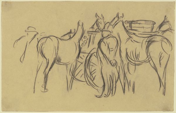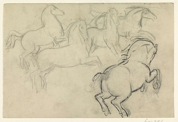 Leo Gestel made this drawing of a man holding two horses in toom with pencil on paper. It's all about the lines, isn’t it? Look how Gestel uses them, not just to outline, but to build up the forms. It’s like he’s thinking through the act of drawing, letting us see his process. There’s a kind of raw energy in the way the lines overlap and intersect. You can almost feel the movement of the horses, their power, their restlessness. And the man holding them – is he in control, or just barely managing? Notice especially the lower part of the horses legs. It’s a scribble, but somehow it captures the animal’s weight. It reminds me a bit of Franz Marc's animal drawings. Both artists are interested in capturing the essence of their subject, not just a literal representation. It’s about feeling, about energy, about the messy, unpredictable nature of life. And that, for me, is what makes art so exciting. It’s a conversation, an exploration, a way of seeing the world anew.