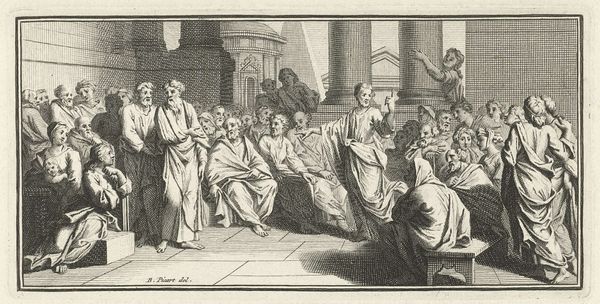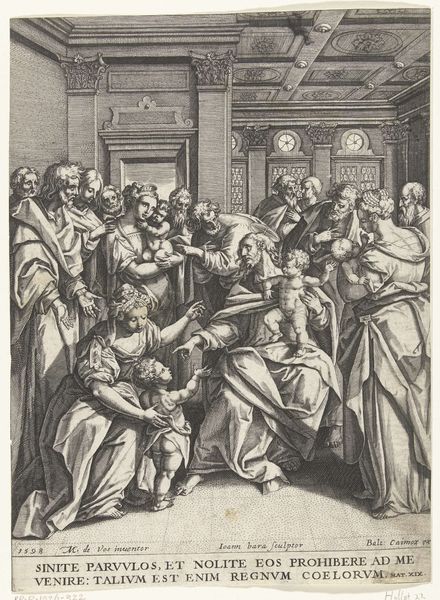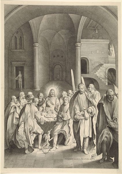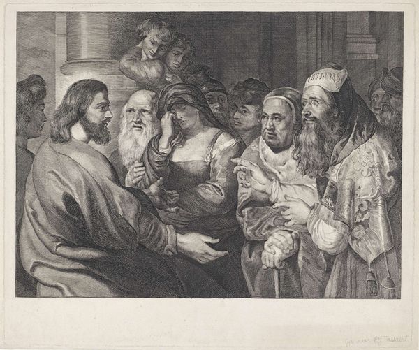 Editor: So, this is "Christus en de cijnspenning," or Christ and the Tribute Money, an engraving that was created sometime between 1622 and 1652. It’s currently housed at the Rijksmuseum. What I immediately notice is the incredible detail rendered in the etching technique. What can you tell me about this piece? Curator: Well, I see an engraving produced during a time of intense socio-economic and religious upheaval. What materials did the engraver utilize, and how did the printing process contribute to disseminating these visual narratives? How does the depiction of Christ engaging with coinage speak to broader themes of labor and value? Editor: That's a good point about labor. I see that it is meticulously created, there are a lot of lines. What kind of labor and craft were involved in producing this print? Curator: Absolutely. And considering the socio-political context, we might think about this piece as reflecting anxieties about wealth and power that the church held in society. Does the work appear to advocate for or against those power dynamics? Editor: That’s fascinating, thinking about the message within the material. It seems to me that because it's rendered as a print, it allows the artist to democratize religion for the everyday person. Curator: Precisely! This easily distributed medium challenges assumptions and facilitates discourse between artwork and societal value. It emphasizes that materials can offer tangible insight into complex cultural systems, wouldn’t you agree? Editor: Yes, definitely. Looking at art from a materialist lens definitely opens up new possibilities of understanding the context and significance of art objects.