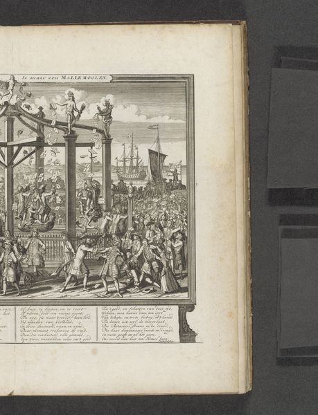Curator: What an incredible engraving. This is "Mallemolen van de Wereld, 1720," dating back to 1720, found here in the Rijksmuseum. It's a fascinating scene rendered in ink on paper by an anonymous artist. Editor: It looks like organized chaos. The details are incredible given the medium, but it has this overall frenetic energy. I am immediately drawn to the dizzying symmetry of the architecture and the swirling bodies, creating a sense of instability. Curator: The architecture you mention is crucial. That structure is the Mallemolen, literally a "mad mill," a carousel or roundabout. It was a place of entertainment but also symbolizes the dizzying, often foolish nature of the world, and humanity's own folly. Look how everyone scrambles for the falling papers. Editor: Are those supposed to be…money? I see the people beneath are quite literally catching the falling scraps as if some higher power, represented above, is throwing down opportunities – whether those opportunities are worthwhile remains to be seen. It's interesting how the artist created depth using hatching techniques. The line weights really build up shadow and define forms in such a small space. Curator: Exactly! These papers represent fleeting opportunities, perhaps lottery tickets or simple tokens of luck. The "mad mill" represents a world turned upside down. Even the landscape in the background hints at earthly pursuits; see the ships sailing off? It's an allusion to global ambition. It’s social satire but executed through this playful lens. What is really striking to me is this symbolism continues through time even now. Editor: It's definitely baroque in its density. I am drawn to the way the artist managed to convey movement and texture, particularly the folds in the clothing and the expressions on the faces, given the constraints of engraving. Each little vignette tells a story. You notice something new each time you look. Curator: Absolutely. Each figure becomes a part of a greater tapestry of human behavior. Knowing more about the cultural context enhances the work's layered meanings. Editor: Seeing it this way, broken into discrete sections which combine for a whole, reinforces how carefully thought out the arrangement really is. Thanks to a bit of social history and sharp, precise visuals, it certainly stays with you long after viewing it.