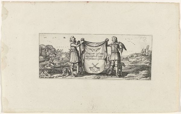 This etching, "Putti met wapen van Namen", was created by Romeyn de Hooghe. The print is dominated by a central heraldic shield, around which the artist has assembled a playful composition. Putti, or cherubic figures, are positioned on either side, framing the scene and adding a sense of baroque dynamism. The shield itself is crowned and backed by an array of flags and weaponry, underscoring themes of power and authority. De Hooghe has meticulously detailed the textures and forms, from the soft curves of the putti's bodies to the crisp lines of the heraldic symbols. This attention to detail, alongside the symmetrical arrangement, creates a balanced yet complex visual experience. The scene engages with the semiotic language of its time, presenting a world where emblems and allegorical figures convey complex political and social messages. The print destabilizes traditional artistic boundaries, integrating cartographic elements with artistic expression.