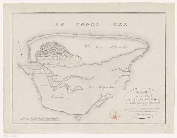 Editor: Here we have Daniël Veelwaard’s “Map of the Island of Rottumeroog,” an engraving from 1809. It strikes me as a very pragmatic piece; all lines and labels. How do you interpret this work, beyond its obvious function? Curator: I see it as deeply enmeshed with power. Mapping has historically been an act of claiming territory, a visual assertion of control. This map isn’t just a neutral depiction of land; it represents a specific gaze, a specific intention to possess and define space. Consider the Dutch context: mapping was crucial to colonial expansion and resource extraction. Editor: So, you're saying it's not just about accurately representing the island, but also about exerting authority over it? Curator: Exactly. Who commissioned this map? Who was meant to use it? Its function was likely tied to economic exploitation or military strategy, reflecting a desire to categorize and manage the landscape and the communities connected to it. Also note, cartography presumes the Western gaze from a higher elevation onto a people and land considered “below”. The assumption is control. Editor: That's fascinating. I hadn’t considered the implications of mapping as an act of dominance. Does knowing that change how we should view landscapes today? Curator: Absolutely. By understanding the history of cartography and its links to colonialism, we can become more critical viewers of contemporary representations of space. We can ask ourselves: Whose perspectives are being privileged? Whose are being erased? It’s about recognizing the inherent power dynamics within any depiction of the land. Editor: I'll definitely look at maps differently from now on! Thank you. Curator: My pleasure! It's vital that we analyze these depictions beyond their immediate impression and consider their historical baggage.