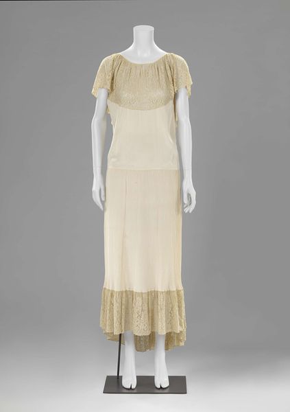 Editor: Here we have a wedding dress with embroidered and ruffled double sleeves, dating from before 1909. It's so beautiful in its simplicity. I'm curious, what do you see in this piece? Curator: It is exquisite, isn’t it? Beyond its aesthetic appeal, this dress whispers stories of gendered expectations and societal constraints of the era. Can you see how the high neckline and long sleeves confine the body, contrasting with the delicate lace suggesting a paradoxical tension between modesty and desirability? Editor: I do. It feels… contradictory. The lace seems almost rebellious within that silhouette. Curator: Precisely! Consider the context: turn-of-the-century ideals positioned women in a restrictive domestic sphere. A wedding dress, ostensibly a symbol of love and commitment, also signified a woman's transition into a new role dictated by patriarchal norms. Do you see the dress as reinforcing or challenging these norms? Editor: That’s a difficult question, but I think it attempts to negotiate them. The extravagance of the ruffles hints at individuality, maybe even quiet defiance? Curator: It certainly complicates the narrative. Furthermore, the pristine white color carries symbolic weight – purity, innocence, but also erasure, a blank slate onto which society inscribed its expectations. How do you think a contemporary bride might interpret this garment? Editor: I imagine she might question its symbolism. Perhaps reclaim its elegance on her own terms, divorced from those older constraints? Curator: Absolutely! And by engaging with it critically, by understanding its historical baggage, she actively reshapes its meaning. Thank you for pointing that out, that is the most important thing about engaging with history and art. Editor: That's a great way to think about it, bringing new perspectives into conversation with history.