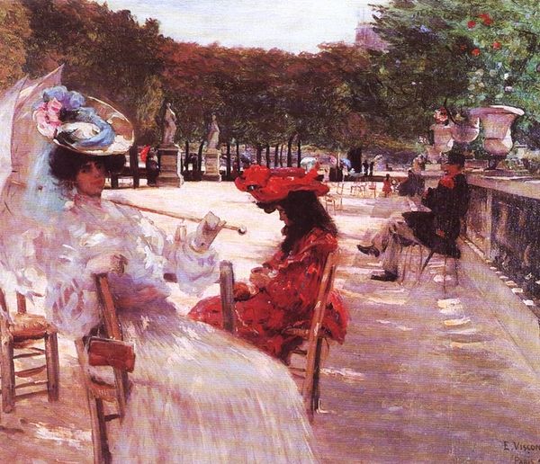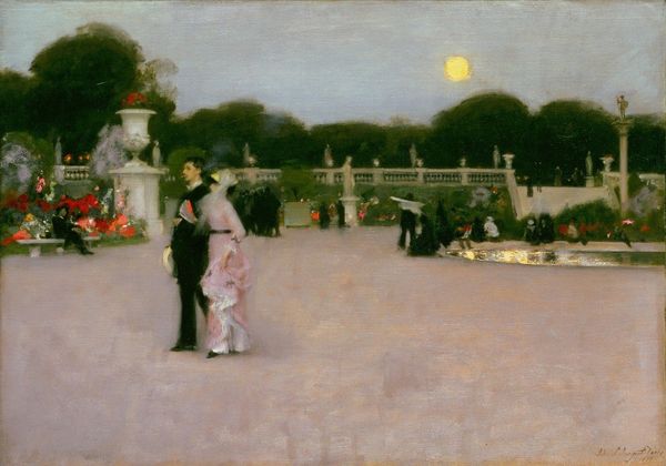 Editor: Here we have Giovanni Boldini’s "Gallant Scene," painted in 1877. It's an oil painting, portraying a group of elegantly dressed figures in what seems like a formal garden. It feels very staged and theatrical, almost like a scene from an opera. What’s your take on this, especially concerning its place in the art world? Curator: What strikes me immediately is the clear self-awareness of performance embedded within the scene. Boldini presents us with a tableau vivant, but one heavily mediated by the social conventions of the late 19th century. Think about the rise of the bourgeoisie, their obsession with leisure, and their desire to emulate aristocratic lifestyles. This painting doesn't simply depict; it performs the *idea* of aristocratic leisure. Editor: So, it’s less about a realistic portrayal and more about conveying a societal aspiration? Curator: Precisely. Notice how Boldini emphasizes the artificiality of the setting – the meticulously manicured garden, the statues, even the swan pond seems too perfect. It's a constructed paradise intended for display, not genuine enjoyment. Editor: That’s a fascinating point. How did these sorts of staged scenes play into the art market at the time? Curator: Paintings like these became commodities, status symbols reflecting the tastes and aspirations of their owners. Owning a “Gallant Scene” suggested an alignment with a certain level of refinement and social standing. The image circulated publicly, both reinforcing and shaping these desires, almost functioning as an early form of advertising for an ideal lifestyle. Look closely; what kind of messages does it seem to promote? Editor: Hmm, that it's important to present yourself with such elegance, leisure and refinement? I never considered how pointedly it reflects cultural aspirations through the public reception and political forces surrounding its creation. Thank you! Curator: It’s a useful reminder that artworks don't exist in a vacuum, and are always in conversation with social dynamics of their time. We can see the social fabric imprinted on the canvas.