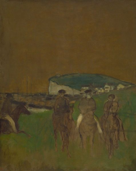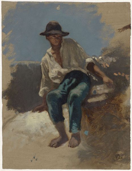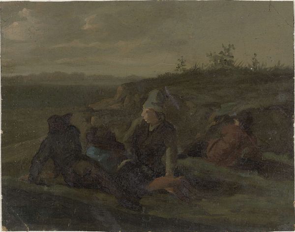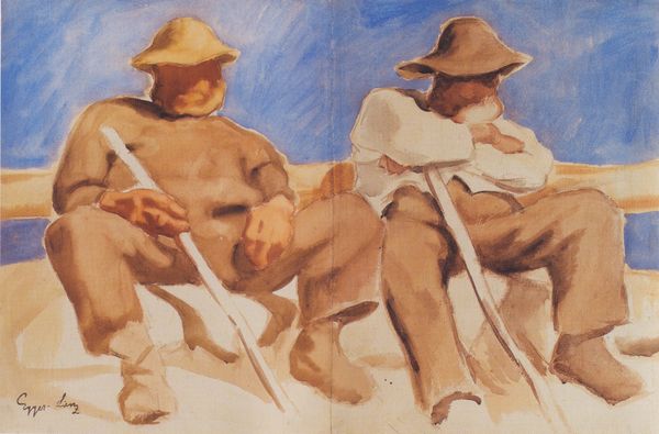 This painting, "Resting Shepherds", by Albin Egger-Lienz presents two figures rendered in earth tones under a pale sky. Notice how Egger-Lienz structures the composition around the geometric solidity of the shepherds, their forms flattened and monumental. The artist employs a limited palette, emphasizing browns and muted yellows that blend the figures with the landscape, suggesting an almost primal connection to the earth. The rough texture, achieved through visible brushstrokes, adds to the feeling of ruggedness and authenticity, emphasizing the shepherds' laborious existence. This is not a romantic vision of pastoral life, but a stark portrayal of physical endurance. This lack of idealization invites a structural reading of power, with the shepherds' rest as a temporary reprieve from the demands of labor. By stripping away conventional sentimentality, Egger-Lienz challenges viewers to reconsider traditional artistic depictions of rural life. The painting invites us to question the cultural codes through which we understand labor and leisure, and their representation.