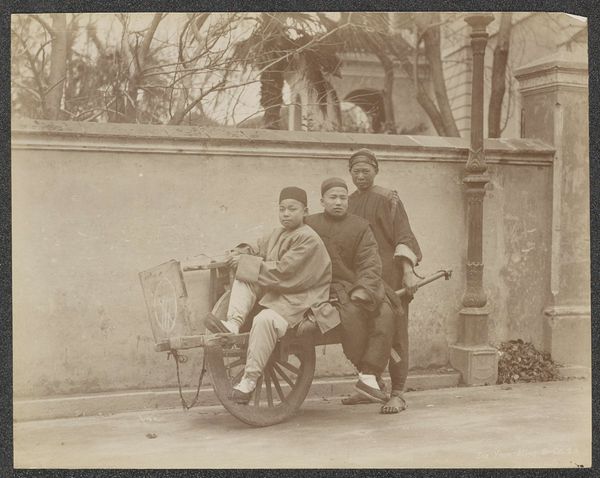 Curator: Here we have a photograph titled "Wilhelm Ochse en Catharina Maria Groennou op een motorfiets op het strand van Valkeveen," dating from around 1934. Editor: It has a certain understated, quiet charm, doesn’t it? The tonal range is narrow and everything appears wonderfully solid, especially that enormous motorcycle! Curator: Absolutely. The realism in this photograph emphasizes the groundedness of everyday life, but that’s an incredibly modern and fast-moving mode of transportation for its time, placed deliberately within an outdoor, seaside environment. I find it fascinating how the subjects position themselves. Editor: Right, she sits very properly and primly sidesaddle—the embodiment of a traditional pose—while he’s up front, looking directly ahead, controlling a marvel of contemporary engineering! There’s an interesting power dynamic at play, I think. The image of masculine progress is juxtaposed to ideas around feminine constraint and outdated cultural roles. Curator: That's a great point. It is a snapshot in time. Perhaps the work reflects the societal tension and gender roles as perceived by the artist. It captures that interwar period when the world was quickly changing, but societal expectations lagged. Though I must say, they both look so calm. A pleasant outing in Valkeveen, despite everything! Editor: Yes, there’s a tangible humanity present that surpasses purely theoretical implications. It gives an unexpected peek into these subjects’ lived experience during a really specific period. You just know they probably loved that beach! Curator: I like the balance it strikes—serious but playful. It invites a story to be created around it and, perhaps, to project a little of ourselves into the narrative as well. Editor: For me, this photograph is a valuable window into the past and the evolving roles of technology and social conventions during a time of immense cultural change. Curator: For me it represents a lovely day at the beach with your spouse during the early days of enjoying new modern modes of transport. What is there not to like?