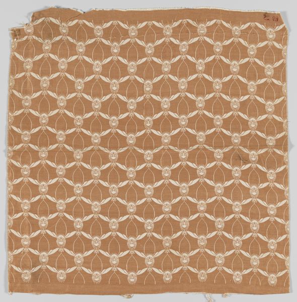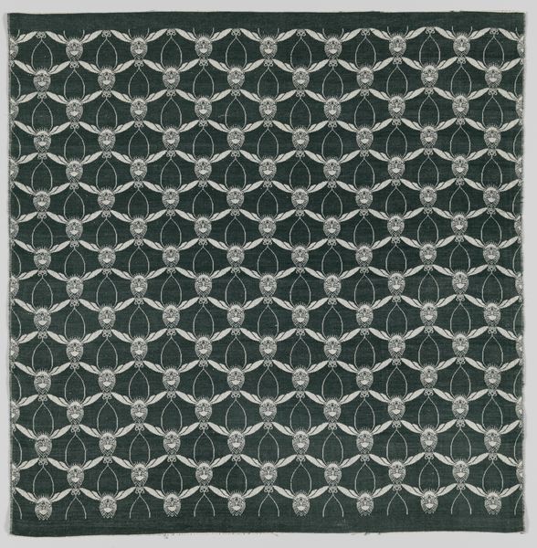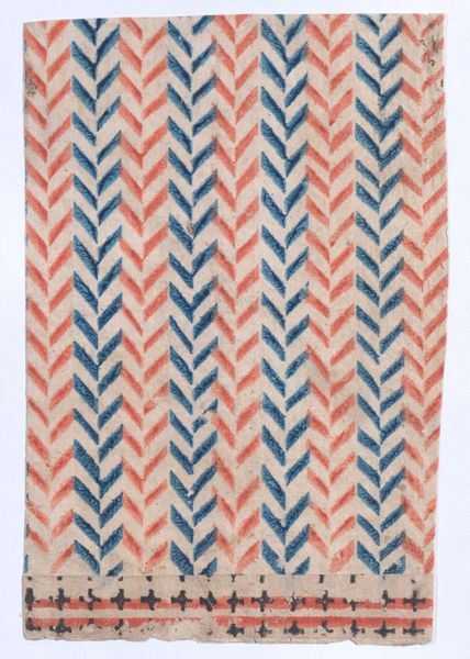 Curator: Soothing, repetitive, and...slightly seasick? My eyes keep wanting to trace those waves. Editor: That's a fantastic observation. What we're looking at is an intriguing piece of textile art from somewhere in the 1800s, simply titled, "Sheet with overall curved abstract pattern," crafted by an anonymous artist. It is housed here at the Met. And yes, it has a hypnotic quality to it. Curator: "Sheet" makes it sound so...utilitarian! When clearly it's striving for more. It reminds me of sound waves or maybe the patterns in sand after the tide goes out. Very calming and primordial. But it could easily trigger dizziness in some of us, I guess. Editor: There's a deliberate visual language being employed here. The zigzags create this rhythm, punctuated by the small dots like musical notes. Zigzags have appeared across so many cultures over vast sweeps of time - their recurrence taps into a deeper psychological impulse, I suspect. Curator: An impulse for what? Cleanliness? Order? No, I get something slightly unsettling here. This rhythm, these waves... it feels like being caught in something larger than myself, a powerful cosmic order but indifferent, even hostile, to human concerns. Maybe it's a metaphor for life’s ups and downs, always presented with a rigid and relentless geometrical scheme. Editor: You know, those dots alter the image somewhat, tempering what might be an aggressive visual motif. Those simple forms add a level of intricacy that complicates the underlying stark pattern. I think it is also related to other abstract drawings with organic patterns made by the same anonymous artist. Curator: Complicates or pacifies? Are those dots there to make sure the underlying pattern isn't *too* threatening? That’s very smart but in the same way it reveals our intrinsic unease when faced with life's harsh geometry. Almost like a way of apologizing for existence, of course I could be projecting... Editor: Not at all! It is difficult to say with precision, but in the final analysis this geometrical pattern touches upon our human drive to perceive underlying orders in an occasionally absurd existence, seeking beauty in the arrangement of form, matter and symbols, wouldn't you say? Curator: Definitely. And sometimes, just feeling beautifully, aesthetically lost is reward enough, too. I see that here for sure!