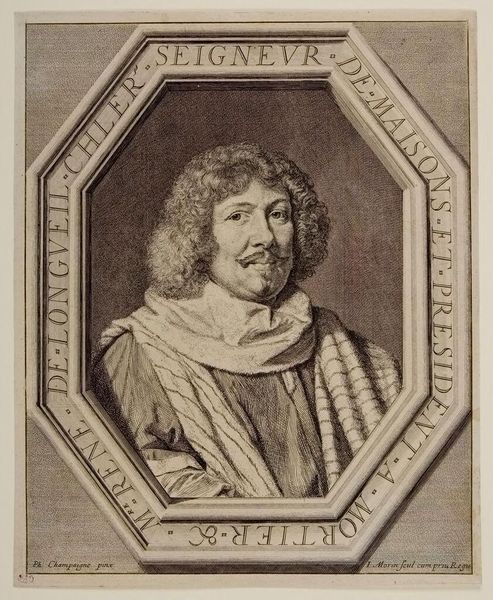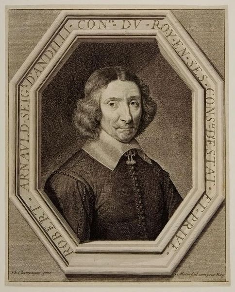 Editor: This is Jean Morin's portrait of Charles de Valois, Duc d'Angoulême. I'm struck by how formal and regal it feels, despite the relatively casual pose. What details jump out at you? Curator: The frame itself is fascinating! It's like a jewel box presenting its precious contents. It’s as if Morin is telling us that Charles de Valois is both a man and a symbol, carefully constructed for posterity. The armor juxtaposed with the soft fabric creates a compelling tension, don't you think? Editor: I didn't notice that contrast before. It definitely adds another layer to the piece. Thanks! Curator: My pleasure! Seeing art through different lenses always sharpens the view.