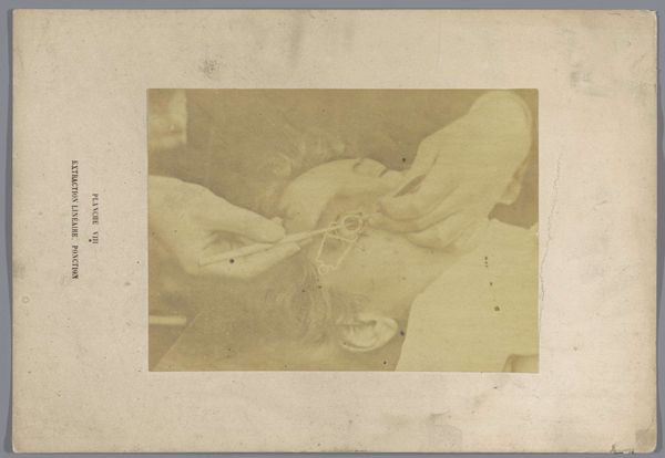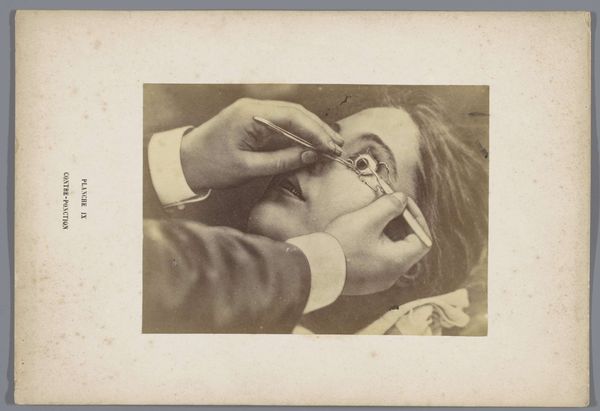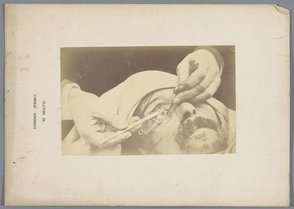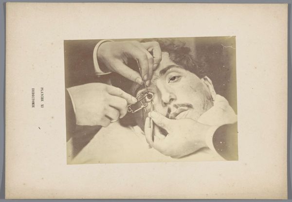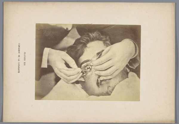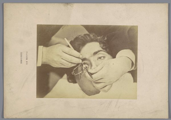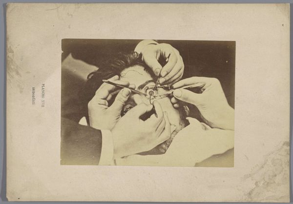 Editor: Here we have a gelatin silver print, titled "Wegschuiven van een deel van de iris tijdens een oogoperatie"—"Sliding a part of the iris during eye surgery." It was taken by A. de Montméja sometime before 1873. It's...intense. It feels both very clinical and also deeply personal. What stands out to you as you look at it? Curator: Immediately, I'm struck by the power of the eye itself as a symbol. Throughout history, the eye has represented vision, knowledge, even God's watchful gaze. Here, we see it quite literally being operated on. Does that shift its symbolic power for you? Editor: Absolutely. The vulnerability is almost unbearable to look at. Curator: Exactly! And consider the cultural context. Before widespread anesthesia and antiseptic practices, surgery held a unique position in the cultural psyche. This image captures that tension between medical advancement and raw, visceral experience. Note the tools and the doctor's steady hands – these are symbols of control and scientific progress. Editor: But also of potential pain and intrusion. It’s a fascinating paradox. I’m thinking of the patient’s perspective. What sort of emotions, memories, and hopes did that expression on their face carry? Curator: Precisely! It pushes us to contemplate not just the medical procedure but the individual's journey through it. Every tool, every hand gesture speaks to a moment loaded with meaning, for the patient, and for the history of medicine. There's such cultural weight embedded here. Editor: I've definitely learned to look beyond the initial shock value to the historical context and enduring symbolism of the eye. Curator: Indeed. It’s a reminder that even scientific images carry significant cultural and emotional echoes.