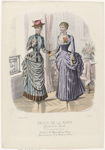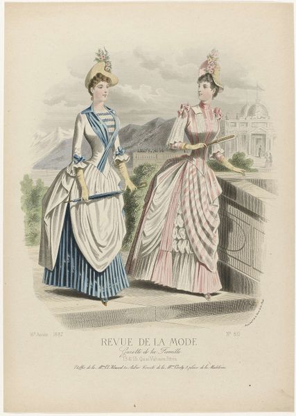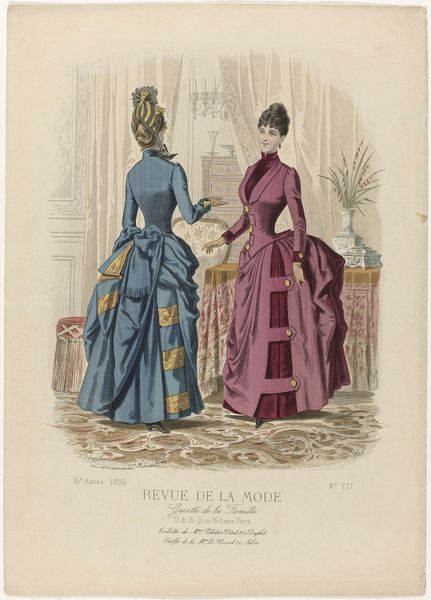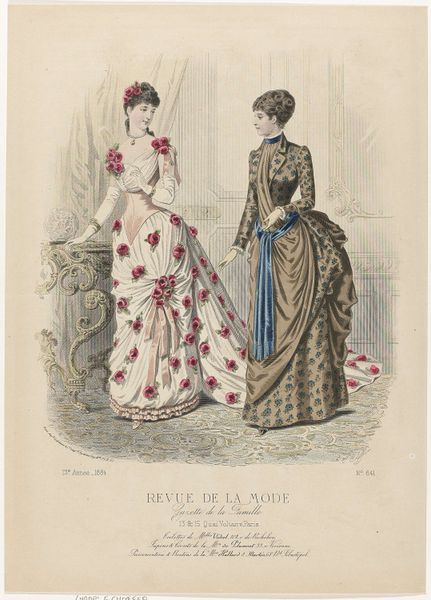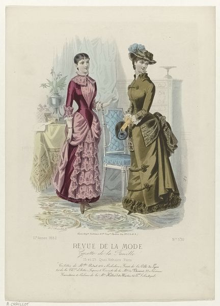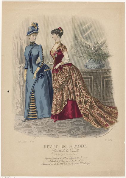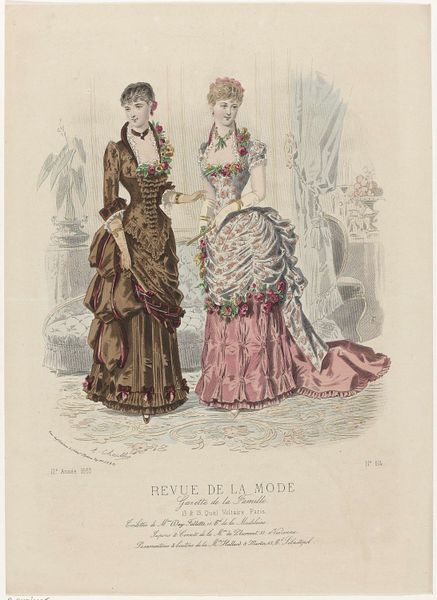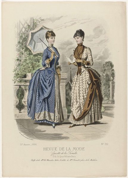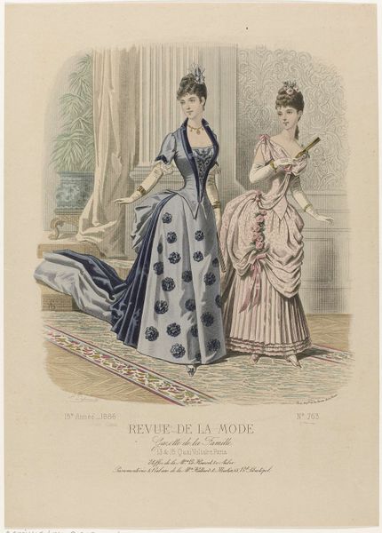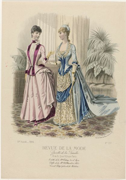 Editor: This is an 1886 print by A. Chaillot, a page from "Revue de la Mode, Gazette de la Famille". It’s a watercolor illustration of two women modeling dresses. I find it fascinating how much detail they put into fashion plates like this. What do you see in this piece, beyond the pretty dresses? Curator: Beyond the fashion itself, it's a window into the construction of femininity and social roles in late 19th-century France. Fashion plates like this weren’t just about showcasing clothing; they were tools used to teach women how to perform their gender and status correctly. How do you think publications like these contributed to the social norms of the time? Editor: That makes sense. I suppose these plates helped define what was considered beautiful and proper, and it must have put pressure on women to conform. Almost like a very early form of targeted advertising! Curator: Precisely. It created a visual standard of excellence while creating desires around their own perceived “lack." The delicate colours and emphasis on specific silhouettes aren’t simply aesthetically pleasing; they’re part of a visual language that communicates aspirations and enforces specific social expectations. Did publications of this era support or subvert artistic convention, or both? Editor: That’s a good point. I hadn’t thought of the print as such a powerful tool. It’s like, this seemingly harmless image actually reflects much deeper social expectations for women during the time. Curator: Absolutely. Art always exists within a cultural context, shaping and shaped by it. Even something as seemingly simple as a fashion plate reveals the complex interplay between art, commerce, and social power. Editor: I see that so clearly now. I’ll never look at a fashion illustration the same way again. Curator: Indeed, this piece, beyond its delicate aesthetics, offers an acute social commentary if we chose to explore and listen.