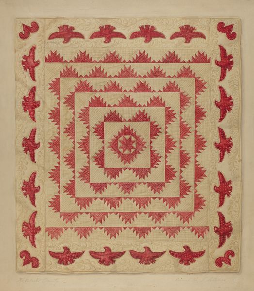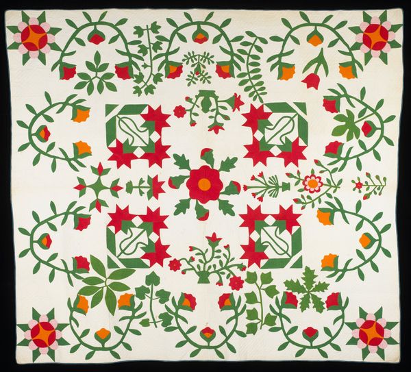 This cotton bedcover was stitched in the late 19th or early 20th century by Susan (Mumma) Major. The prominent floral motifs speak to a broader human impulse to find order and beauty in the natural world. Notice the stylized flowers arranged in symmetrical, mandala-like patterns. These designs reflect an ancient fascination with floral symbolism. The central rosette and surrounding blossoms carry echoes of ancient sun symbols, representing life, vitality, and the cyclical nature of existence. Consider how this motif has travelled through time. Similar floral arrangements appear in ancient Roman mosaics and Renaissance tapestries, each time adapted to new cultural contexts. The emotional resonance of flowers remains constant, tapping into our collective memory of growth, renewal, and the transient beauty of life. The quilt provides both comfort and visual delight, engaging viewers with the archetypal power of floral symbols. This reinforces the cyclical progression of symbols that resurface, evolve, and assume new meanings in different historical contexts.