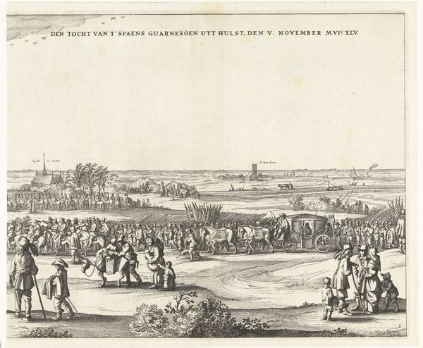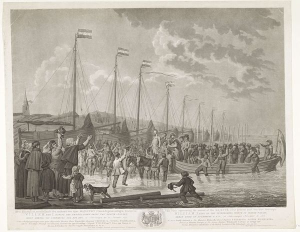 Curator: Ah, "Aankomst van de prins van Oranje te Scheveningen, 1813", an engraving by Cornelis Bogerts. The crisp lines, the almost photographic detail... it's striking for its precision, don’t you think? Editor: I do, but it also strikes me as rather…formal. Look at all those tiny people, stiffly arranged on the beach. It feels more like a meticulously staged tableau than a real, spontaneous moment of jubilation. Curator: Well, it does depict a very specific moment: the arrival of Prince William I on Scheveningen beach in November 1813, marking the end of French rule. Contextually, we have to remember this was meant to inspire feelings of national unity. Editor: Right, and engravings like this served as propaganda, disseminating that image of a powerful, legitimate leader widely, which raises questions about who gets to be visible and whose stories are told, and from what perspective. Curator: Yes, these images help in consolidating that political narrative through neoclassicist techniques. The artist seems concerned with conveying a sense of order and purpose. Yet there is a romantic undercurrent, it attempts to capture that emotion as well. Editor: The landscape, in particular, the beach meeting the turbulent sea seems to capture something grander than human politics. There are some dark aspects to it, the artist perhaps did not intend for the image to be perfect. It also reminds me about movements against neocolonialism and how the locals may have perceived it at the time, with feelings other than joy. Curator: I get that. It’s a staged event but there’s an interesting, complex energy at play. What seemed joyous perhaps concealed deeper sociopolitical turmoil and undercurrents, no doubt. Editor: Precisely. Which ultimately challenges the simplicity of historical grand narratives and prompts a critical reevaluation, no? Curator: Indeed! It allows a closer analysis of the values it represents.