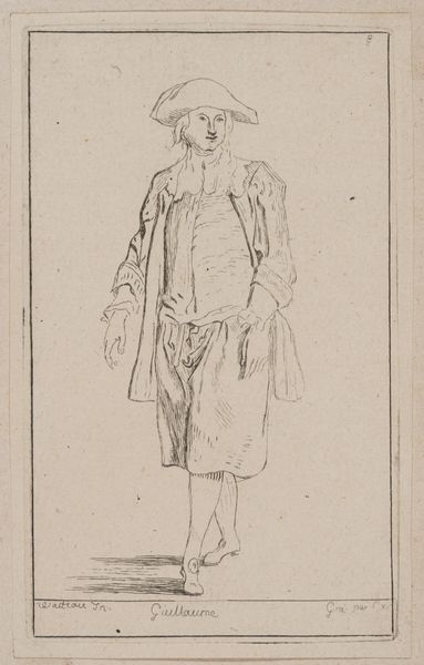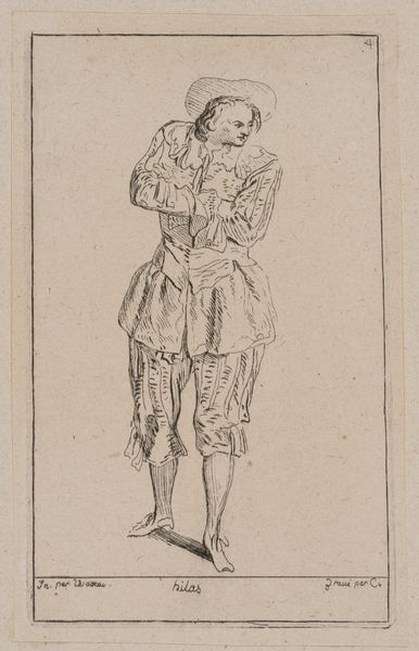 Editor: This is "Tircis" by A. Claude Philippe de Thubières, comte de Caylus. It's a small etching of a figure, seemingly a theatrical character, and its sketchy quality feels quite modern to me. What strikes you about this piece? Curator: It's fascinating how Caylus, a prominent figure in the 18th-century art world, uses etching to evoke a sense of spontaneity. Consider the social context: how does this relate to the rise of print culture and the democratization of images? Does the artist's social standing influence our interpretation of his work? Editor: That's a perspective I hadn't considered. It makes me think about who had access to these images and how they might have been viewed differently then. Curator: Exactly. And think about the role of the artist and the function of such a work. It serves as an interesting window into the artistic and social values of its time. Editor: I hadn't thought about how the social context would alter the image so drastically. Curator: Thinking about the political function of such images allows us to analyze art in a more historical way.