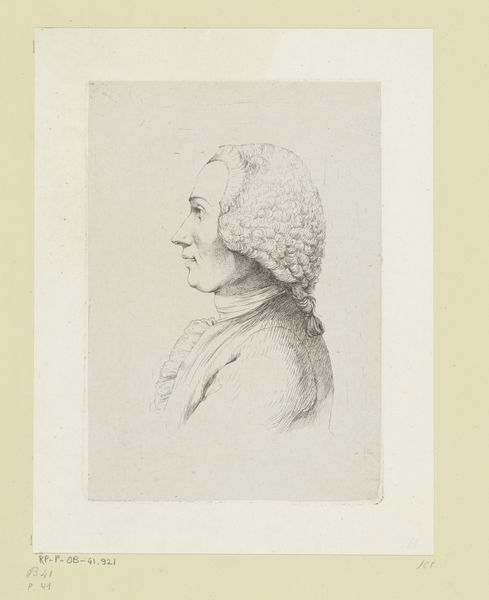 Curator: Let’s consider this captivating profile portrait, titled "Profielportret van een oudere man met pruik", housed right here at the Rijksmuseum. While its precise creation date is open to some debate, it’s believed to originate somewhere between 1750 and 1840, conceived by the skilled hand of Augustin de Saint-Aubin. Editor: Ah, yes, this older gentleman! I’m immediately struck by a certain fragility, or perhaps vulnerability in this image. The delicate pencil strokes...it’s as if he's almost fading away. There's a whisper of melancholy, wouldn't you agree? Curator: I appreciate that perspective. From my understanding, this work embodies certain aspects of Neoclassical art, where there was indeed this focus on idealism, though tempered here by, as you note, the medium's subtlety. And of course, it places the figure squarely within the aesthetic conventions of the period – the powdered wig is a distinct marker of social status, for example. Editor: Of course, the wig screams of that era. Yet, despite its function as social signaling, I am curious about what kind of expression the artist has successfully given the portrait. The subject has a straight posture, and slightly frowning brow, like he disapproves of something or maybe somebody. Curator: Exactly! While it is "just a drawing", these sketches offered insight into a personage beyond courtly artifice. The materiality contributes enormously to this aim as well, as Saint-Aubin captures a psychological presence amidst his social position. Editor: The slight unevenness, that hazy line quality—it almost imbues the piece with a modern feel, or invites contemplation about what "real" is when looking at one's image, wouldn't you agree? A candid observation about aging that moves beyond pure flattery. It offers this…human connection. Curator: Ultimately, this unassuming portrait drawing opens dialogues about the period itself, about how individuals negotiate social roles, and about portraiture and the human presence it has come to represent. Editor: Agreed. Saint-Aubin may have just aimed for an efficient depiction, but he gave this man on paper something genuine and everlasting!