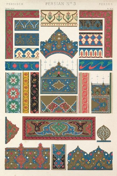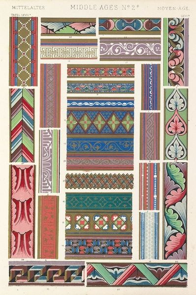 Editor: So, here we have Owen Jones' "Celtic No. 2" from 1856, a print showcasing various Celtic patterns. What immediately strikes me is the sheer intricacy of the designs. How would you begin to analyze something this complex from a formal perspective? Curator: I would start by deconstructing the visual elements, primarily the line. Notice how the lines intertwine and intersect, creating a sense of endlessness. Jones masterfully employs the knot motif, a hallmark of Celtic art. Consider also how the composition arranges discrete forms on a relatively neutral ground, emphasizing their shapes and their interplay. Editor: The use of color seems quite deliberate too, right? How does that play into the overall impact? Curator: Indeed. The colors, though varied, are carefully balanced. They highlight specific areas of the design, guiding the eye and reinforcing the overall symmetry. The contrast between the dark lines and the colored details accentuates the formal structure of each element. How do the various uses of bilateral or radial symmetry in these discrete forms change your reading of them, considered as a whole? Editor: I see that some forms become focal points with the use of color. It is like the visual weight distribution, leading you across the whole piece, not allowing a stagnant observation. Curator: Precisely. We see Jones is not simply replicating existing patterns; he's reinterpreting them through a refined formal lens. Editor: I can see that. Focusing on the formal aspects really helps appreciate the skill and artistry behind what I previously saw as "just patterns." Curator: It’s through that close analysis of form, and their interactions, that we truly understand an artwork’s inherent qualities and, ultimately, its power.