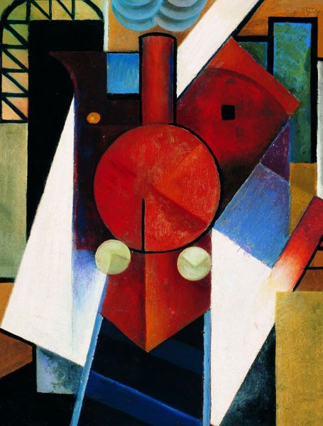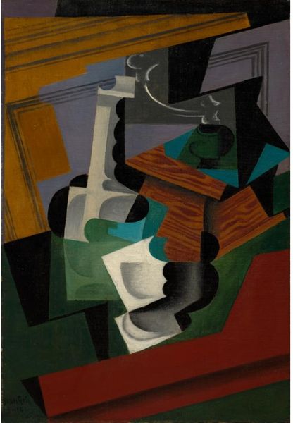 Curator: Here we have Juan Gris's "Still Life on a Chair," created in 1917. Gris used oil on canvas for this exploration of Cubist principles, currently residing at the Georges Pompidou Center in Paris. Editor: It has such a grounded, yet playful mood to it, don’t you think? The subdued colors contrasting with the very angular construction create a push and pull in my mind. Curator: Absolutely. I see a deliberate orchestration of symbolic elements here. A pitcher rendered as geometric forms immediately catches the eye. Notice the chair itself and how it becomes almost architectonic, suggesting stability and domesticity. Editor: It's intriguing how Cubism fractures these everyday objects. Is Gris hinting at the fragmentation of society during the First World War, or perhaps questioning the conventional perspectives during times of change? Curator: That's an insightful reading. The symbolism extends further—objects on chairs carry historical and social meaning. They stand as potent signifiers of leisure, the domestic sphere, or perhaps an artist's studio. Think of the symbolism surrounding the color. It all adds layers. Editor: It raises questions of accessibility, though. By breaking objects into geometric forms, who gets to unlock their secrets? Was Gris attempting to dismantle hierarchies in art or unintentionally creating them? And speaking of hierarchies, what about the positioning? Did you see a symbol? Curator: An interesting provocation! Gris, like other Cubists, used fracturing and recomposition as an intellectual and even playful disruption of representation, questioning how we perceive reality itself. So you’re right in that dismantling hierarchies was definitely present. Editor: A disruption with lasting implications, definitely. It challenges us to decode reality. Curator: A symbolic landscape built from domestic fragments—what stays with you after contemplating this work? Editor: Definitely how it echoes the need for constant vigilance—always dissecting accepted structures and norms and questioning who holds the hammer. What about you? Curator: The interplay between what appears static—still life, objects in space—and dynamic forces in art history has a unique quality. I’m drawn back to the timeless mystery of how mundane things gain immortality through symbols.