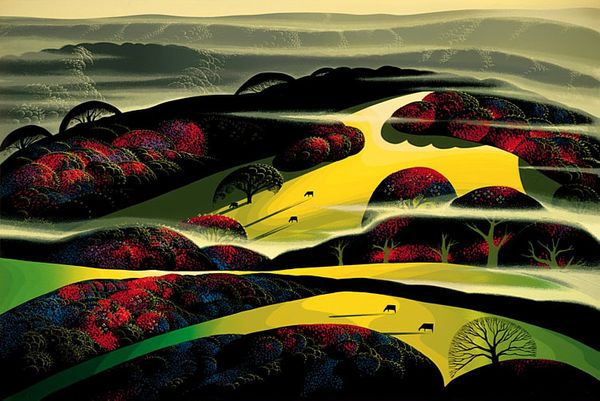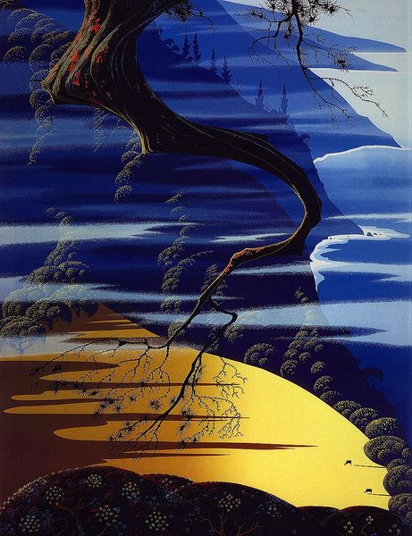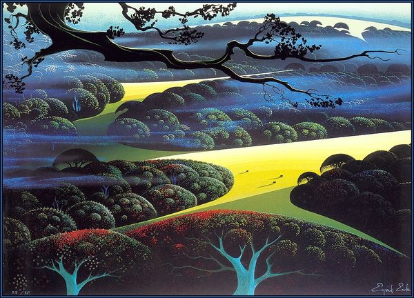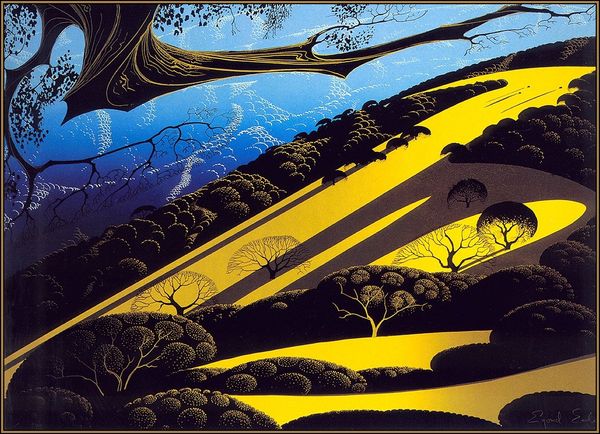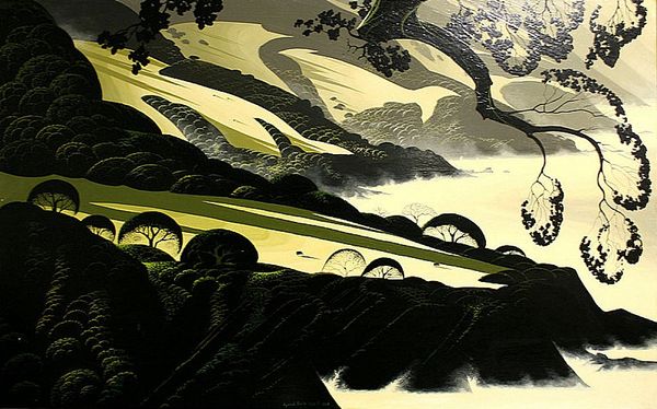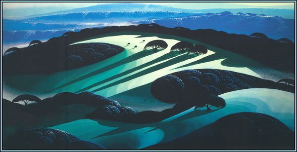 Editor: So this is "Hidden Hills", an acrylic on canvas painting by Eyvind Earle. The hills seem to glow under this strange light. I'm struck by how geometric everything is. It's both calming and slightly unsettling. What stands out to you when you look at it? Curator: Well, for me, it's the material reality of Earle's process that jumps out. Look at how the acrylic is applied, so smooth and deliberate. He's almost mass-producing these idealized landscapes. What kind of labor goes into this pursuit of idyllic scenery? Are we looking at a critique of industrial landscape production rather than a sincere effort to capture beauty? Editor: That's a really interesting point. I hadn't considered the labor involved in creating something that appears so effortless and pristine. Do you think he’s purposefully drawing attention to that? Curator: Possibly. Think about the social context – post-war America, mass production, the rise of suburbia. Are these "Hidden Hills" a reflection of that societal push towards manufactured perfection? Is it organic or industrially conceived? Is the sharp delineation more mechanical reproduction than personal expression? Editor: It definitely makes you reconsider that initial sense of calm I felt. Now, I'm seeing those sharp lines and the controlled gradients as almost…artificial. Curator: Exactly! And notice the limited palette. It’s beautiful, sure, but also cost-effective. Acrylic paint itself becomes a statement. The materiality emphasizes the connection between fine art and consumer culture of the time. It allows for accessible images, commodifying our desires for nature. How does knowing that influence your understanding? Editor: It flips it completely. I came in thinking about this as a beautiful landscape, but now I see it as a product, maybe even a commentary on our consumption of idealized versions of nature. Curator: Precisely. It demonstrates the capacity of even seemingly straightforward landscapes to hold complex ideas about production, labor, and the market. Editor: I'll definitely be approaching landscapes with a more critical eye now. There’s a whole other layer I hadn't even considered!