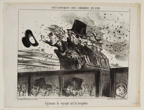 Curator: Honoré Daumier's lithograph, "Famished Travelers Fling Themselves at the Buffet," really captures a moment, doesn't it? Editor: Yes, it evokes a visceral feeling! The aggressive lines, the crowding—it's chaotic but the black and white contrast creates a rhythm. Curator: The figures, caricatures really, remind me of primal urges surfacing within the context of modern travel. Observe the man, almost trampled, losing his hat. Editor: The distortion, it's a form of emphasis. The artist exaggerates the facial features, the grasping hands, to amplify the desperation. Curator: Exactly! It speaks volumes about social commentary through a symbolic representation of human behaviour in rapidly changing times. The railway itself was a symbol. Editor: I'm stuck on the energy generated by the arrangement; it's a marvel how Daumier uses simple lines to convey so much. Curator: The lithograph, then, becomes a poignant reminder of how cultural shifts can unearth fundamental aspects of the human condition. Editor: And how visual economy can deliver such a punch!