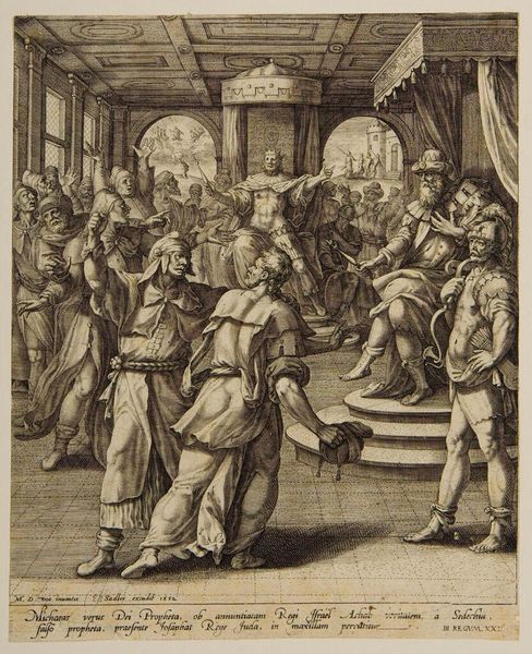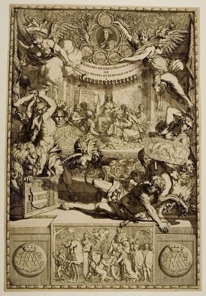 Editor: This is Gérard Audran's "Martyrdom of Saint Agnes", from the Harvard Art Museums. It's a powerful depiction, and the figures are arranged in a way that highlights the dramatic tension. What strikes you about it? Curator: The engraving presents us with a complex layering of power dynamics, doesn’t it? We see the earthly violence against Agnes, but above, a divine intervention. Consider how the male figures enact the martyrdom, while female figures offer comfort. How might we interpret the role of gender in the construction of sainthood here? Editor: That’s a fascinating point. I hadn’t considered the gendered aspect so directly. So, are you suggesting that the piece is not just about religious devotion, but also about societal power structures? Curator: Precisely. Think about how the control over women's bodies has historically been tied to social and political control. Agnes becomes a symbol of resistance against these structures, even in her martyrdom. Editor: I see now. It’s more than just a religious scene; it's a statement about agency and power. Thanks for making that clear. Curator: Art allows us to examine those tensions, and reflect on power.