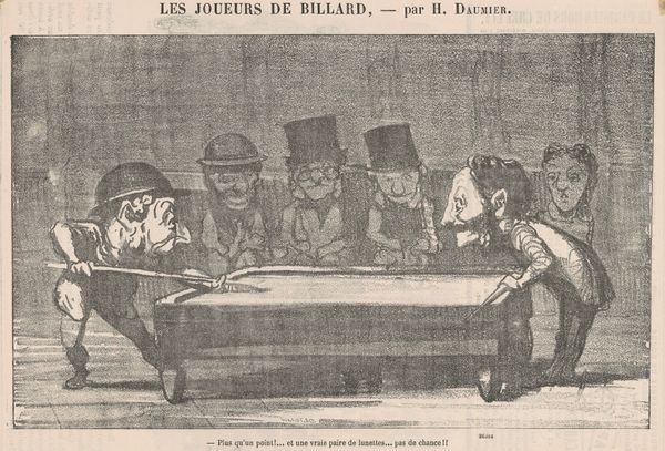 This print was made by Honoré Daumier using lithography, a process involving drawing with a grease crayon on a prepared stone, then printing. The choice of lithography is significant; it allowed for relatively quick and inexpensive reproduction, perfectly suited to Daumier’s role as a satirical commentator on French society. His caricatures often targeted the bourgeoisie, and here we see that theme emerge again in the form of two gentlemen playing billiards. The artist exaggerates their features to humorous effect. Daumier was deeply engaged with the social realities of his time. Lithography enabled his work to reach a wide audience through newspapers and journals. This print is not just an image but an act of social critique, made possible by a specific technology and the labor of the artist himself. It reminds us that art is always embedded in a web of production, distribution, and consumption.
