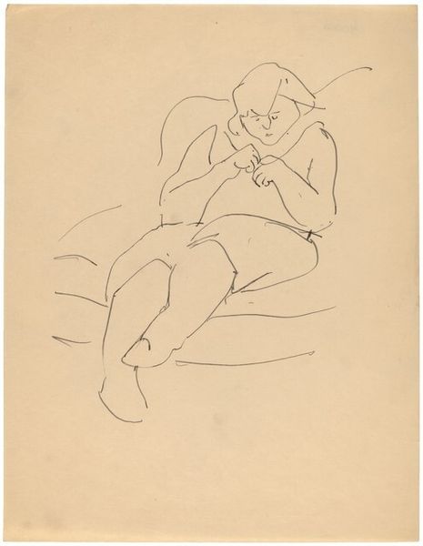 Editor: So, this drawing, "Seated Female on Couch Knitting(?)," is by Mark Rothko and made with pencil on paper. There's something really intimate about it, a sense of quiet domesticity, almost like we’re peeking into a private moment. How do you read this piece? Curator: Well, knowing Rothko primarily for his abstract expressionist works, it's interesting to see such an early figurative drawing. It reminds us that artists often explore various styles and themes before arriving at their most recognized form. Given the probable date and Rothko's social awareness, what can the domestic scene suggest about the role of women and leisure in the early 20th century? Editor: That's a good point. The act of knitting or sewing seems so traditional, almost like a stereotype of women's work. Curator: Exactly. This drawing serves as a document reflecting cultural expectations. Furthermore, it could even subtly challenge those expectations by its sheer act of representation within an evolving art world increasingly interested in breaking with tradition. Do you think Rothko's later exploration of pure abstraction represents a rejection of this earlier representational style and the societal norms associated with it? Editor: I never thought of it that way. Perhaps the figure dissolving into blocks of colour can be seen as freeing the individual from social constraints, which is expressed so subtly here. Curator: Precisely! Considering the context allows us to unpack the layers within what seems like a simple sketch and see its connection to broader socio-political conversations. Editor: That makes me appreciate how something so straightforward can actually have such deeper cultural roots, which are visible when you see it in its historical setting. Curator: Indeed, art acts as both a mirror and a lens through which we perceive society. Editor: This has really changed my initial read of the piece! It's exciting to find new angles to view Rothko’s works and other works.