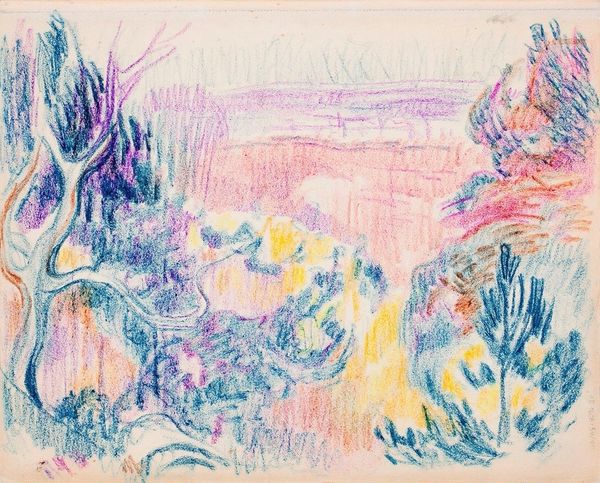 Curator: Magnus Enckell’s "Maisema," created in 1912, draws us into a pastel landscape shimmering with Neo-Impressionist and Symbolist sensibilities. What catches your eye? Editor: Initially, the chromatic intensity. There’s a dreamlike haze to the entire composition, created by these overlapping pastel strokes, that feels otherworldly. The house, if that's what it is, almost seems to float. Curator: I’m interested in how the dreaminess you note intertwines with broader currents in early 20th-century Finland. Enckell was a key figure in bringing European modernism to Finnish art, advocating for art that explored the psyche, that challenged established social and artistic norms. Do you think the artwork embodies this kind of psychological confrontation? Editor: Absolutely. The image contains elements that appear unstable. Look at the weeping branches and fragmented structure. Are those boats to the side or only suggestions of vessels? Everything dissolves in your peripheral vision, demanding further inspection, so in that way it reminds me of the precarious nature of life during periods of social transformation. Curator: It seems the use of pastel underscores Enckell's intentions. A medium prized for its softness and delicacy, it enables him to depict the landscape with an ethereal quality, far from any kind of pure naturalism. Consider how this contrasts with the realist traditions then prevailing. Editor: Indeed. These blues, greens, and yellows create such interesting textures. I see what seems like water indicated by these linear and fluid strokes, almost like stylized wave motifs from traditional maritime cultures. Perhaps it's indicative of constant change and the passage of time. Curator: And doesn’t that sense of transience beautifully capture the Symbolist goal of reaching beyond the tangible to reveal unseen emotional and psychological states? Enckell positions us, as viewers, in that liminal space. Editor: I agree. Through an aesthetic rooted in exploring emotion and visual metaphor, the symbols invite the viewer to contemplate existence and their inner worlds. Thank you. Curator: A compelling landscape that uses layered strokes to speak volumes. Thank you.