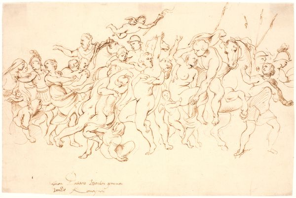 Micco Spadaro made this pen and brown ink drawing, Studies of a Group of Seated Figures and of a Flying Figure, in Naples, Italy, in the mid-seventeenth century. It appears to be preparatory sketches for a larger work, perhaps a history painting or an altarpiece. In this period, the institutions of the church and the aristocracy exerted enormous influence on artistic production in Naples. Spadaro's image employs visual codes drawn from classical antiquity and Christian iconography. We see seated figures draped in classical robes, and floating figures that might be angels or allegorical personifications. These are all typical features of Baroque art, which served to reinforce the power and authority of the ruling elite. To better understand Spadaro's drawing, we might research the patronage networks and artistic academies that shaped his career. We can also analyze the broader social and political context of Naples in the 17th century, a time of upheaval and transformation, to consider the meaning of art as something contingent on historical context.
