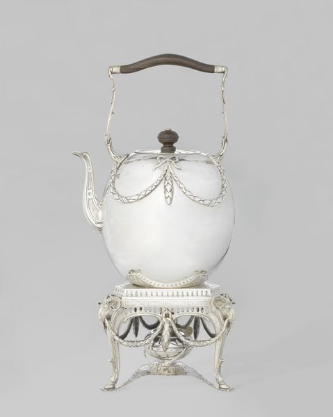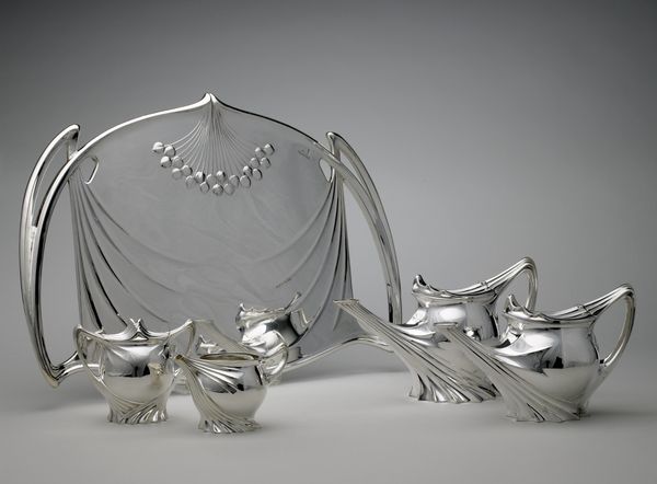 Curator: Here we have an exquisite tray created around 1904 by Paul Follot, currently held at the Minneapolis Institute of Art. The piece is crafted from silver, reflecting the elegance of the Art Nouveau style. Editor: It's so sleek, isn’t it? The shine is almost blinding! The curvilinear forms and floral motifs give off a feeling of restrained luxury and sophistication. It seems utterly impractical but visually captivating. Curator: Absolutely. Follot was a master of translating organic forms into refined, almost geometric shapes. Notice how the handles rise and arch like stylized plant stems, echoing the botanical theme embossed on the tray's surface. It’s not just decorative; the structure integrates function with pure aesthetic pleasure. Editor: That surface! You’ve got to wonder about the silversmith’s labor in achieving this level of detail and polish. Were these handmade or part of early mass production? How did that affect access to and consumption of such design in early 20th century France? Curator: Good questions. While exact production methods aren't documented in detail, pieces like these typically involve skilled artisans using specialized tools for hammering, chasing, and polishing the silver. Even if there were some early mass-production techniques, a level of individual handcrafting would have been integral to bring forth details. It blurs the boundaries of industry and fine craftsmanship we continue to find ourselves in a similar moment, even now. Editor: So, it's not just about its visual language, it is also an emblem of early modern craft labor and status. We must think about those unacknowledged makers who shaped this design vision. Curator: I agree. There is an intersection between art, labour and design we must constantly unpack, in this instance, revealing hidden historical context. The dialogue the “Tray” invites us to continue. Editor: It provokes one to rethink boundaries of where Art Nouveau started and where does functional silver craft stops.