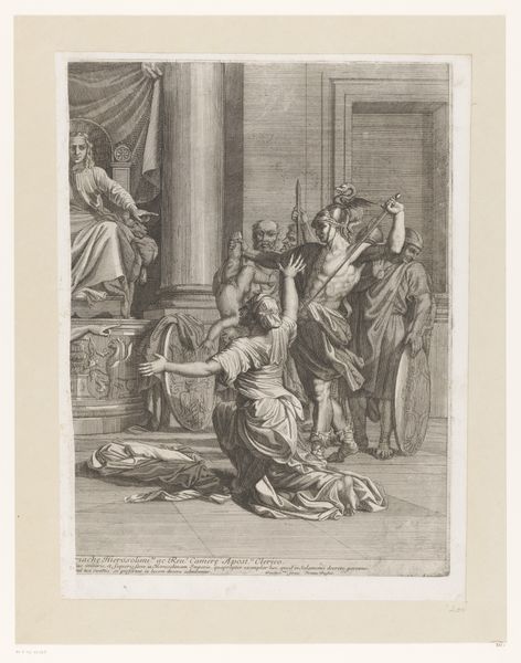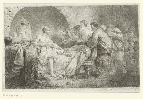 Curator: My word, isn't this engraving utterly captivating? "Tu Marcellus Eris," created by Charles Simon Pradier in 1832, it’s just steeped in classical drama. The neoclassical style fairly leaps off the page, wouldn't you say? Editor: It's certainly…stark. Almost oppressive, even with the clear, academic lines. It gives off this powerful feeling of impending doom, and this really reflects what it represents. Marcellus' death and Augustus' grief is palpable here. Is that what the title alludes to? Virgil's prophesy about Marcellus' doomed fate? Curator: Precisely. Virgil’s line, "Thou shalt be Marcellus," from the Aeneid. The engraving, housed here at the Metropolitan Museum of Art, perfectly captures the moment. I find it almost heartbreaking. Do you notice the dramatic light? Editor: The chiaroscuro is strong. I also love how the setting really emphasizes imperial power: we're in a grand interior with strong vertical lines that focus the scene; everything feels solid and impenetrable. A naked, warrior statue standing guard with a drawn sword adds to the ambiance. Curator: Oh, yes, the warrior sculpture looms over everything. But look at the faces—the artist’s skillful hand at depicting the despair, especially the women and the elders witnessing such a tragic demise. There's something undeniably beautiful about the scene, even in its sorrow. Pradier, you know, was excellent. I really love that line. Editor: Right. In light of Pradier and the context of its creation, perhaps what strikes me the most is how historical narratives get solidified into what feels like inescapable truths—in part, precisely because of beautifully-wrought artworks such as these. There's power in memorialization; and responsibility, too. Curator: I couldn't agree more. It leaves you contemplating the nature of fate, doesn't it? And mortality! It seems to float between capturing beauty and truth. That combination is quite evocative. Editor: It truly does, and by emphasizing this specific telling, other versions fade, while sociopolitical norms consolidate. It definitely invites thoughtful contemplation about more than just a single death. Thanks for shedding some light on this powerful and somewhat foreboding image.