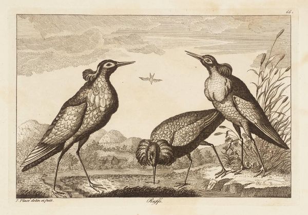 Curator: Adriaen Collaert created this print, "Guinea Hen and Pheasant," sometime between 1580 and 1618. It depicts exactly what the title promises. Editor: The birds look so weighty, almost overburdened by their own plumage. There’s a somber, stately quality to the image. Curator: The painstaking detail achieved through the engraving process must have been incredibly labor-intensive. Think about the production of these prints; they were likely part of a larger series intended for scientific study or aristocratic display. Editor: The birds, positioned against a detailed landscape, remind me of emblems of status. The guinea hen, an "African" bird as labeled, signals expanding global trade and European fascination with the exotic. Curator: Exactly! And the pheasant, also carefully rendered, speaks to established hunting traditions and land ownership. It's fascinating how this print reflects both natural observation and social hierarchy. Editor: It makes you wonder about the intended audience and the cultural weight these images carried. I see these birds as more than just birds; they are embodiments of a complex early modern world. Curator: It certainly adds a layer to our understanding of early modern visual culture. Editor: Indeed.